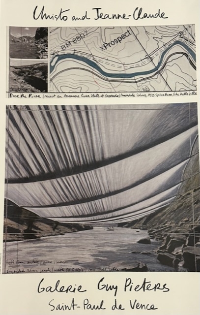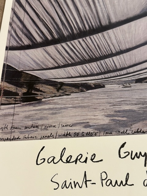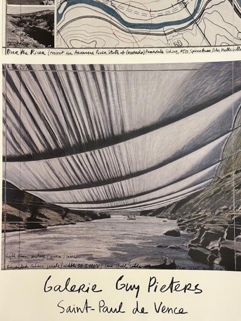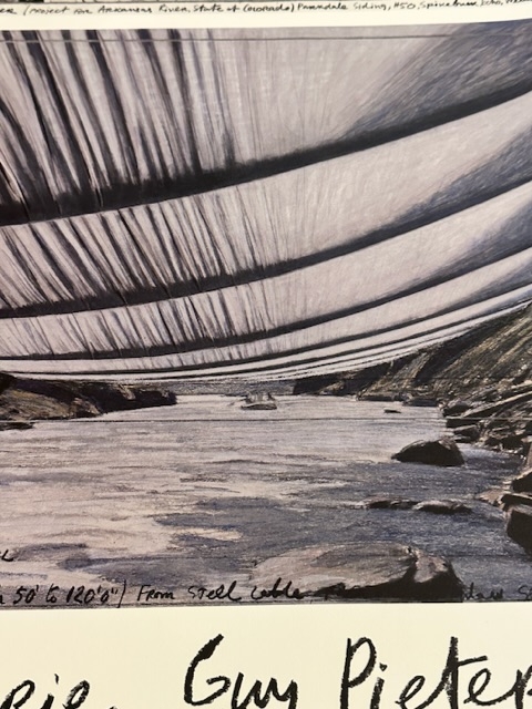 HEEL MOOIE PRINT VAN CHRISTO AND JEANNE-CLAUDE. DEZE PRINT TOONT EEN WERK VAN CHRISTO OVER ZIJN " OVER THE RIVER" PROJECT EN IS UITGEGEVEN DOOR GALERIE GUY PIETERS. DE PRINT IS OP DIK PAPIER EN IS IN HEEL GOEDE STAAT. AFMETINGEN VAN HET BLAD ZIJN 63 X 100 CM.