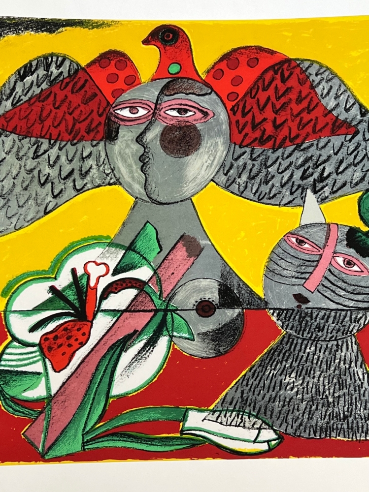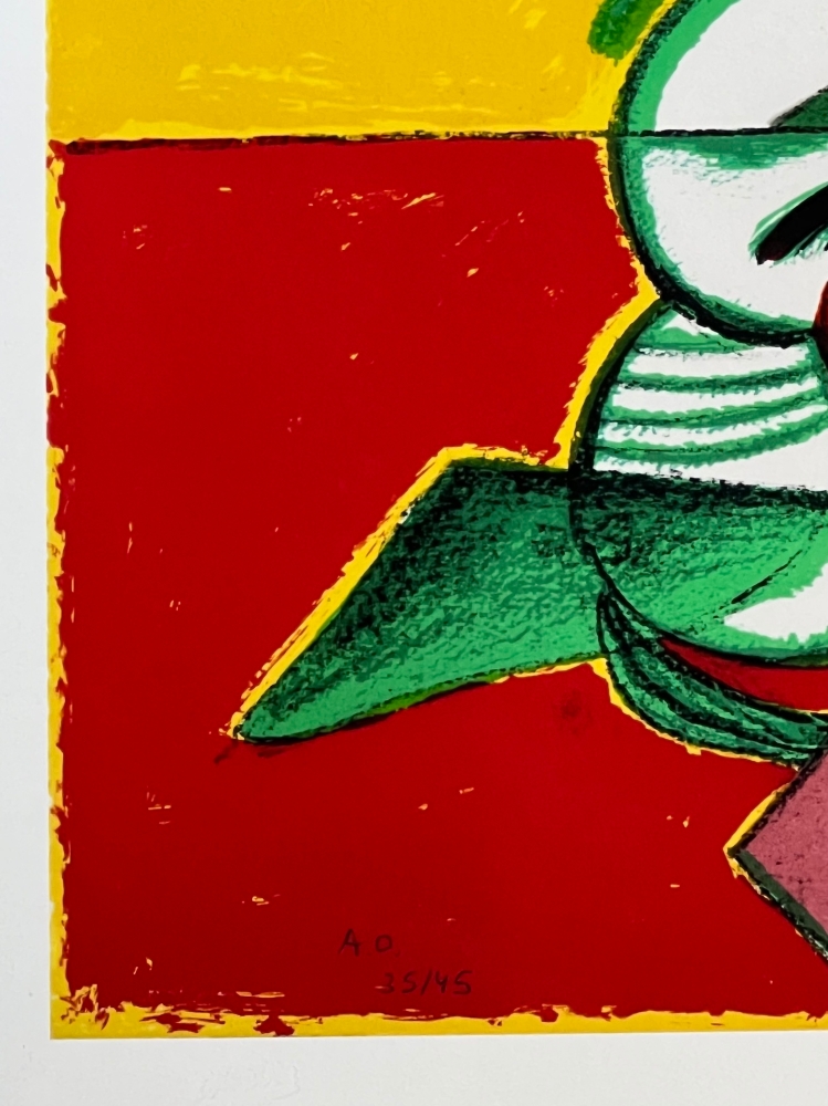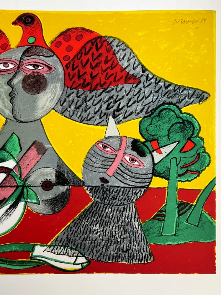 Werk uit 1984 van Guillaume Corneille, die hier speelt met prachtige tegenstellingen van kleuren die dicht bij coloristische schilders als Gauguin of Matisse staan. Heruitgave geautoriseerd op 45 exemplaren naar de originele litho. Genummerde editie. Droogstempel van de edities en stempel op de rug: Archives officielles Guillaume Corneille / Schana B Editions. Totale afmetingen : 51,5 x 66 cm. Perfecte staat. Gedrukt op Belgisch geweven papier (hennep) met natuurlijke lithografische pigmenten. Guillaume Corneille was één van de stichtende leden van de Cobra groep met Karel Appel, Asger Jorn, Christian Dotremont, Constant, Jacques Doucet, of Alechinsky. Cobra tentoonstelling met de grootste Amerikaanse collectie van Corneille's werk in Miami in het voorjaar en de zomer van 2023. Retrospectieve van het werk van Corneille in het Cobra Museum in Amstelveen, die net is afgelopen op 15 januari. Uitgave van een Cobra / Corneille postzegel door Bpost in 2023. Juwelen van Corneille te zien in de Boghossian Stichting tot 14 mei 2023 (Ornamentum, Collectie Diane Venet)