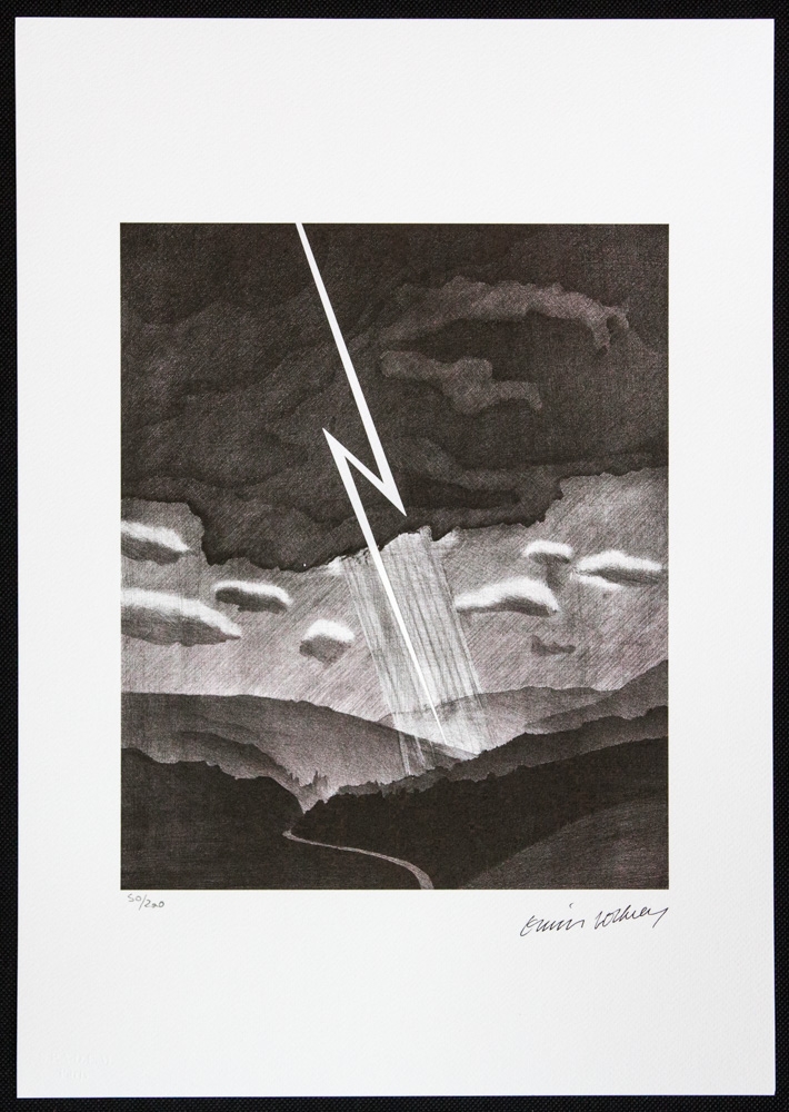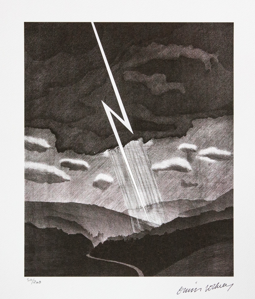 David Hockney (naar) "Lightning" uit "Weather Series", gelimiteerde oplage van 200 exemplaren, offsetlithografie, plaat gesigneerd rechtsonder, genummerd in potlood linksonder 50/200, dik katoenpapier, met reliëfstempel "SPADEM, Paris", bladformaat 35 x 50 cm, zonder aanvullende documentatie, verkocht zonder lijst; wij bieden in-house verzending, als de koper meerdere items wint, zullen we de verzending combineren