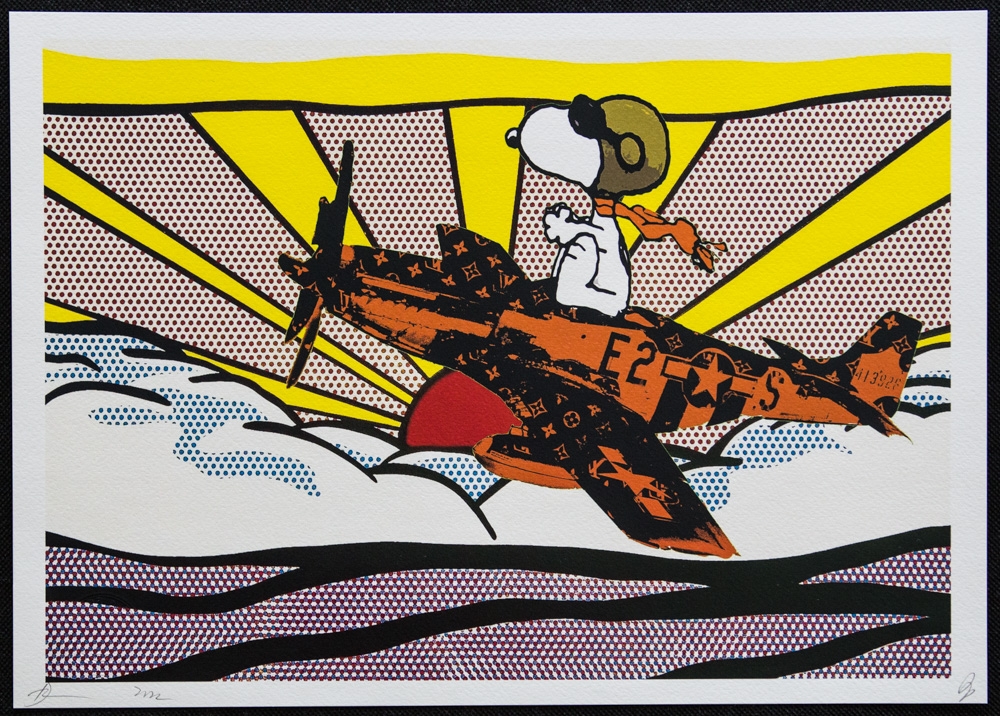 DEATH NYC "Flying Snoopy & Sunrise - Lichtenstein" DEATH NYC is een straatartiest gevestigd in New York. Zijn pseudoniem is een acroniem voor "Don't Easy Abandon the Hope". Print is blind gestempeld, wordt geleverd met een ondertekend DEATH NYC Certificaat van Echtheid en Gold Seal-sticker, afmeting: 45 x 32 cm, met de hand gesigneerd, uitstekende staat, wordt niet ingelijst verkocht, wij bieden de in-house verzending aan, als de koper meerdere items wint, zullen we verzending combineren