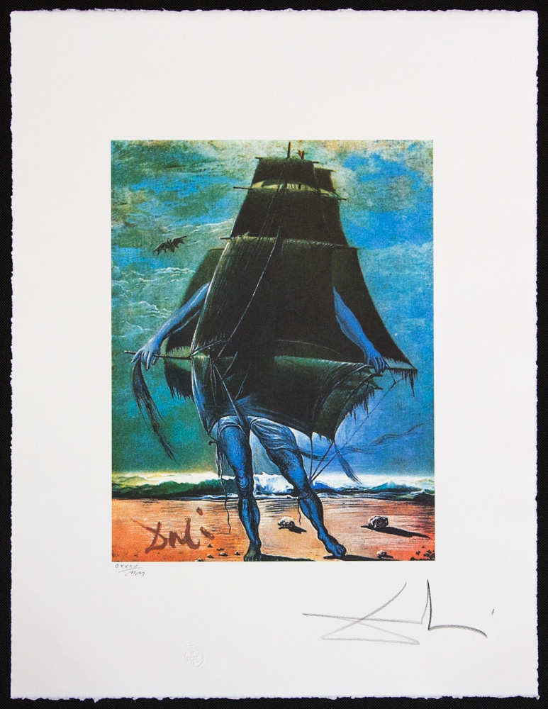 Salvador Dali (naar) "Le Bateau" offsetlitho, bladformaat 50 x 65 cm, gesigneerd rechtsonder "Dali", genummerd in potlood linksonder CXXXV/MM, gelimiteerde oplage 2000, sterk watermerk BFK Rives papier Frankrijk, oplage onderaan gecentreerde huisstempel "G. Dali", zonder aanvullende documentatie, verkocht zonder lijst; we bieden binnenvaart aan, als de koper meerdere items wint, zullen we de verzending combineren