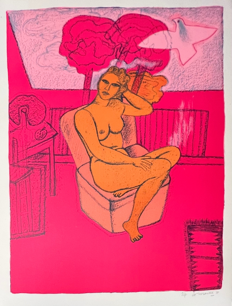 "Vrouw bij het raam" of "Vrouw in haar roze interieur Een betoverend werk dat doet denken aan de composities van Matisse. Zeldzaam en mooi werk gesigneerd, getiteld en gedateerd door de hand van de kunstenaar. Kunstenaarsexemplaar E/A met Atelier Corneille stempel op de achterzijde. Cobra tentoonstelling met de grootste Amerikaanse collectie van Corneille in Miami in voorjaar en zomer 2023. De Cobra-retrospectieve in het Cobra Museum in Amstelveen is net afgelopen op 15 januari. Uitbrengen van een Cobra / Corneille postzegel door Bpost in 2023 Sieraden van Corneille tentoongesteld bij de Boghossian Stichting tot 14 mei 2023 (Ornamentum, Collectie Diane Venet) Originele litho van de schilder Guillaume Corneille (1922-2010), geboren in Luik uit Nederlandse ouders en stichtend lid van de Cobra-groep met Karel Appel, Asger Jorn, Constant, Dotremont en later Alechinsky en Jacques Doucet. Totale afmetingen : 74 x 55 cm - Zeer goede staat - Veilige verzending met UPS