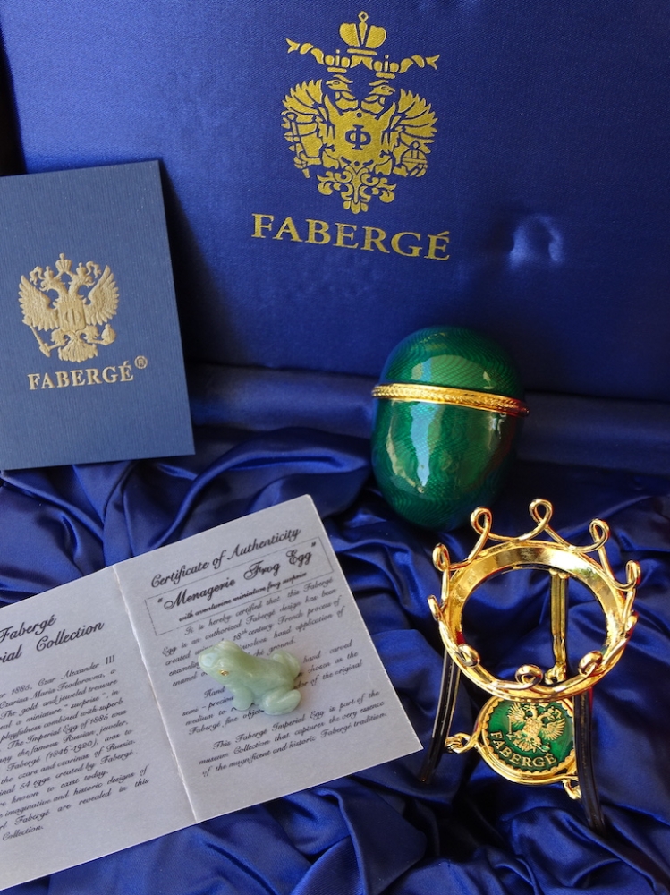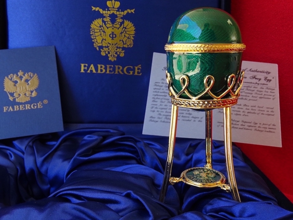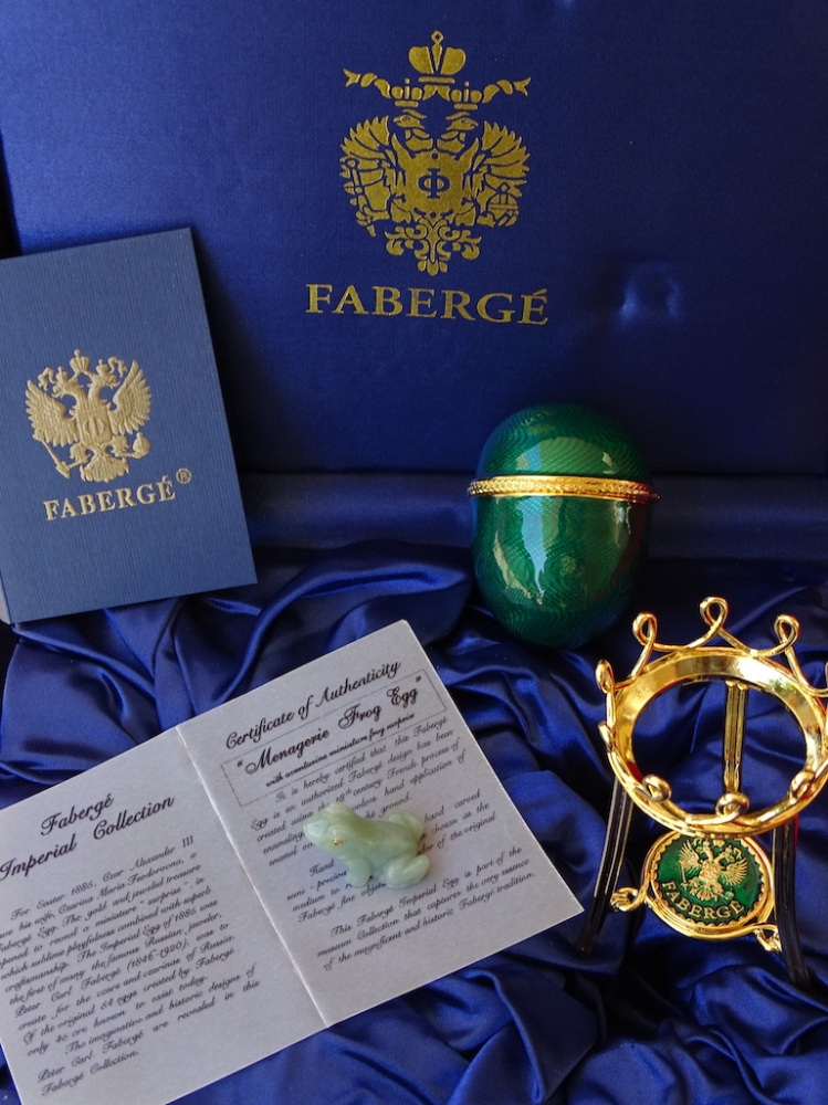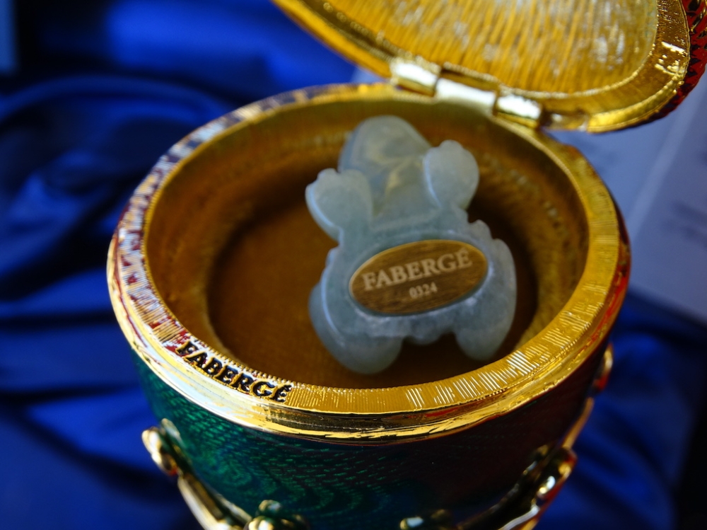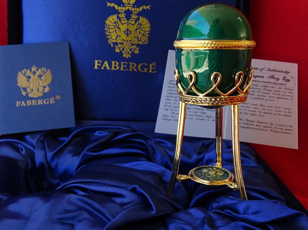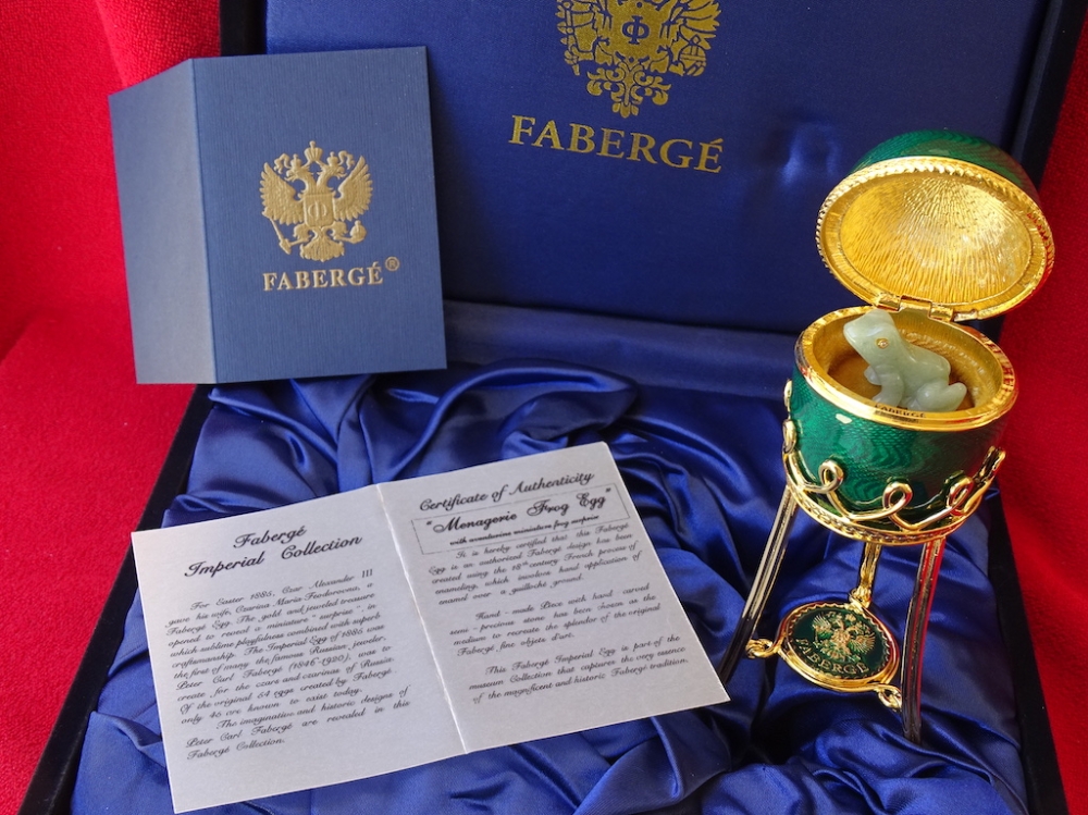 House of Fabergé - Imperial Egg - Hanger binnenin, volledig gestempeld, Certificaat van echtheid inbegrepen - Emaille Imperial Fabergé Ei met COA - Certificaat van Echtheid - 24 karaats gouden afwerking - Emaille Dit is een limited edition, zeer zeldzaam om te vinden emaille met een 24 karaats vergulde afwerking en meer dan 200 Oostenrijkse strass steentjes met een zeer mooie glans. Afmetingen ei en bodem ca. 12 cm, ei ca. 7 cm De familie Fabergé is afkomstig uit Frankrijk, maar werd gedwongen het land te verlaten vanwege religieuze vervolging. In de 18e eeuw verhuisde het gezin naar Rusland. Peter Carl Fabergé werd op 30 mei 1846 geboren als zoon van een goudsmid. Na in de leer te zijn geweest bij verschillende meester-zilversmeden in Duitsland, Frankrijk en Engeland, keerde Peter Carl Fabergé terug naar St. Petersburg als een zeer ervaren vakman. In 1885 schonk Peter Carl Fabergé het eerste keizerlijke ei aan tsaar Alexander III en werd al snel de beroemdste juwelier ter wereld. Investeren in Fabergé is net zo'n goed idee als investeren in goudstaven of zelfs investeren in de kunst van grote kunstenaars zoals Warhol, Chillida, Roy Lichtenstein Basquiat of Banksy.