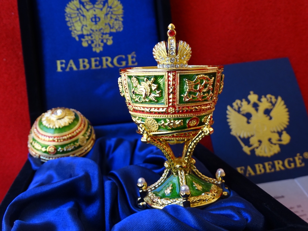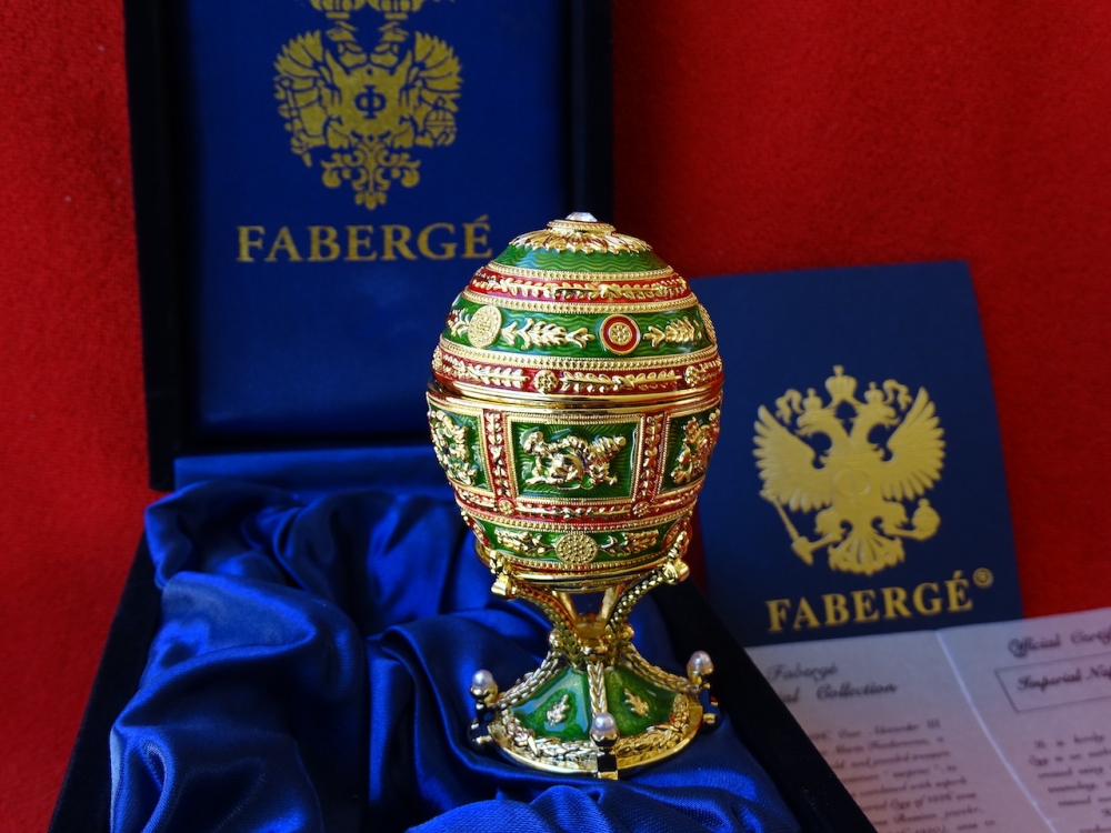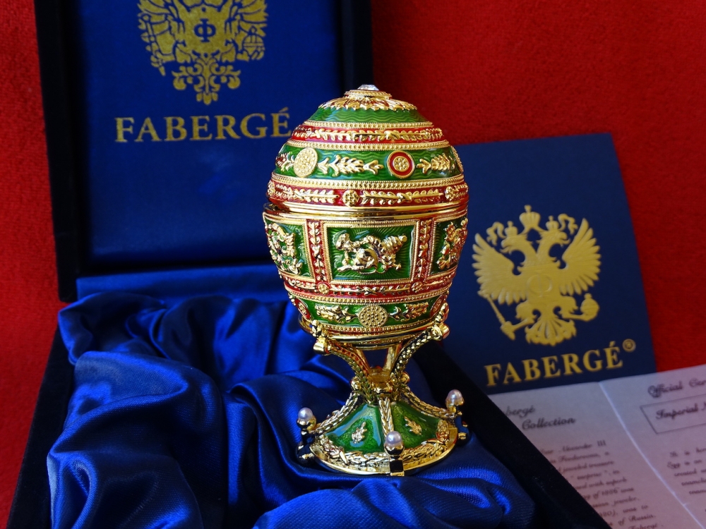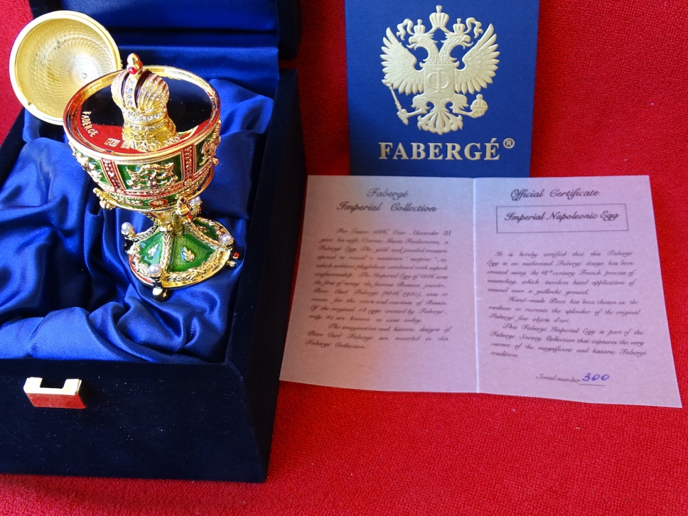 House of Fabergé - Imperial Egg - Hanger binnenin, volledig gestempeld, Certificaat van echtheid inbegrepen - Emaille Imperial Fabergé Ei met COA - Certificaat van Echtheid - 24 karaats gouden afwerking - Emaille Dit is een limited edition, zeer zeldzaam om te vinden emaille met een 24 karaats vergulde afwerking en meer dan 200 Oostenrijkse strass steentjes met een zeer mooie glans. Afmetingen ei en bodem ca. 9 cm, ei ca. 6 cm De familie Fabergé is afkomstig uit Frankrijk, maar werd gedwongen het land te verlaten vanwege religieuze vervolging. In de 18e eeuw verhuisde het gezin naar Rusland. Peter Carl Fabergé werd op 30 mei 1846 geboren als zoon van een goudsmid. Na in de leer te zijn geweest bij verschillende meester-zilversmeden in Duitsland, Frankrijk en Engeland, keerde Peter Carl Fabergé terug naar St. Petersburg als een zeer ervaren vakman. In 1885 schonk Peter Carl Fabergé het eerste keizerlijke ei aan tsaar Alexander III en werd al snel de beroemdste juwelier ter wereld. Investeren in Fabergé is net zo'n goed idee als investeren in goudstaven of zelfs investeren in de kunst van grote kunstenaars zoals Warhol, Chillida, Roy Lichtenstein Basquiat of Banksy.