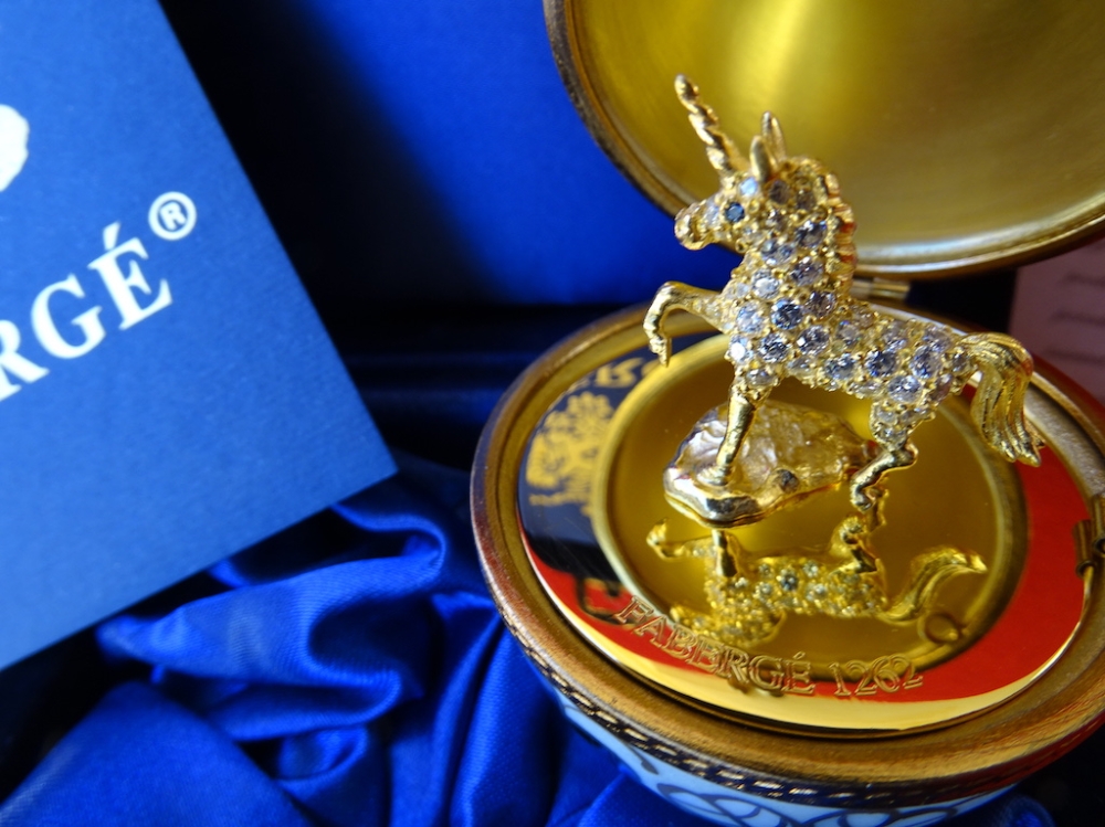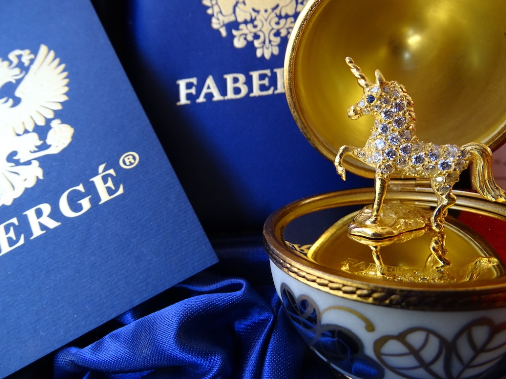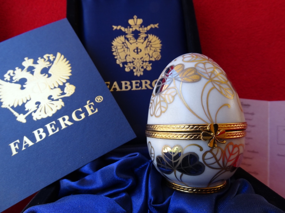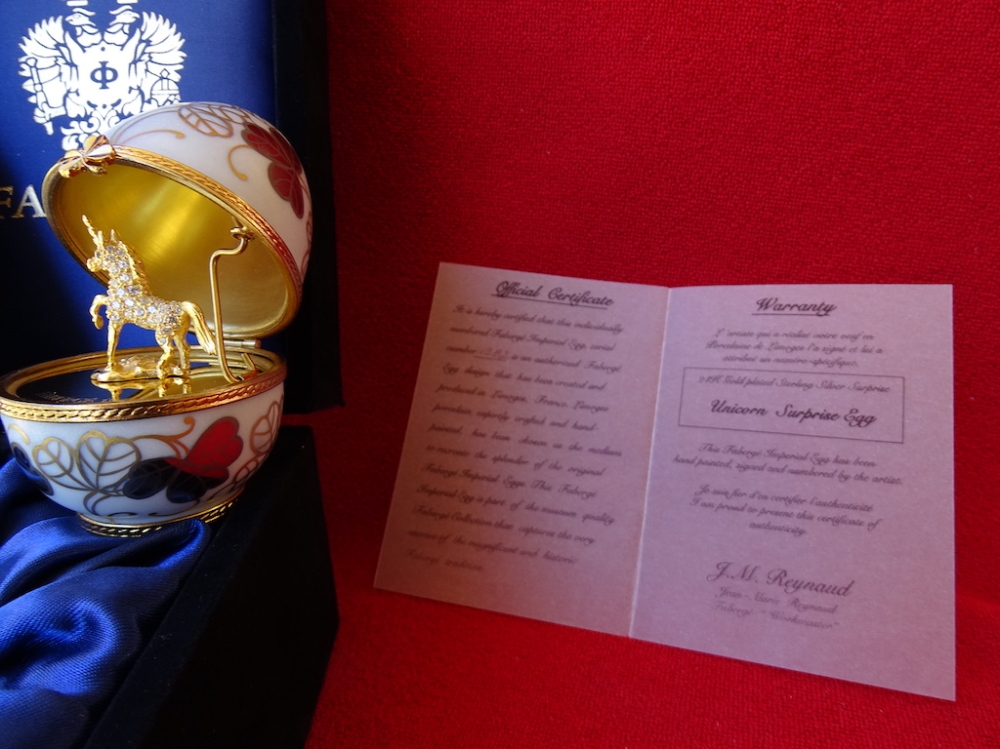 Imperial Egg - 24-karaats gouden afwerking Originele doos erbij 24 karaat verguld, fijn Limoges porselein Dit ei is exclusief gemaakt door Maison Fabergé. Het is een zeer gewaardeerd object op de kunstmarkt. Ei met een zeer mooie glans. De set is in zeer goede, uitstekende staat. Zie de vele foto's om een goed beeld te krijgen van alle details en mooie artwork op dit ei.