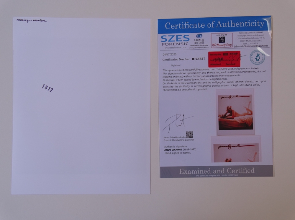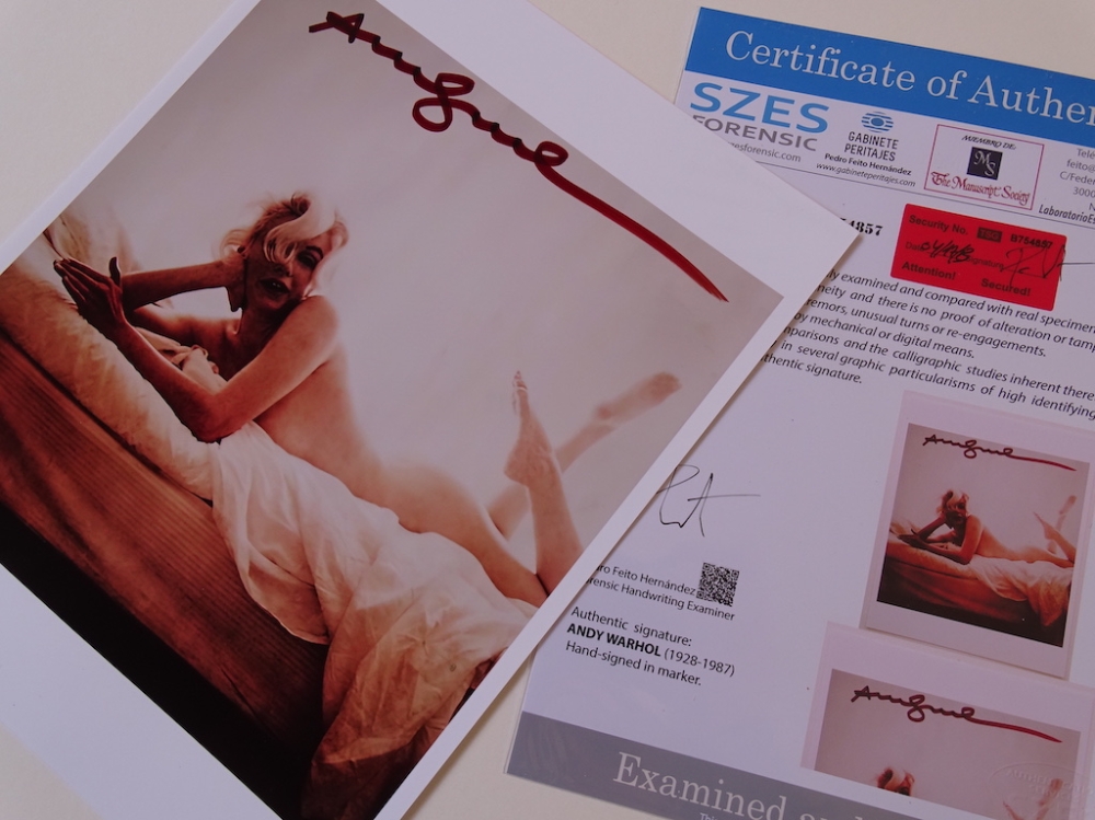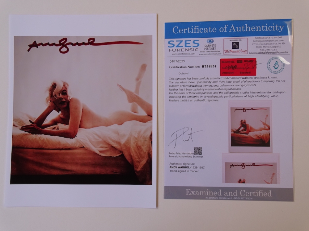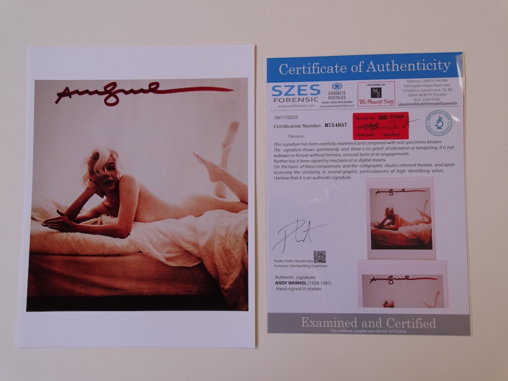 Andy Warhol (1928-1987) - Marilyn Andy Warhol, hand signed, COA included, offset print Warhol has been the subject of numerous retrospective exhibitions, books, and feature and documentary films. The Andy Warhol Museum in his native city of Pittsburgh, which holds an extensive permanent collection of art and archives, is the largest museum in the United States dedicated to a single artist. Warhol has been described as the "bellwether of the art market". Many of his creations are very collectible and highly valuable. His works include some of the most expensive paintings ever sold.[7] In 2013, a 1963 serigraph titled Silver Car Crash (Double Disaster) sold for $105 million. In 2022, Shot Sage Blue Marilyn (1964) sold for $195 million, which is the most expensive work of art sold at auction by an American artist. Contents