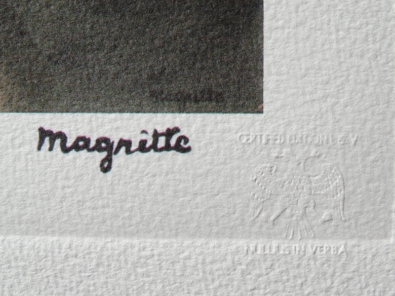 Rene Magritte, ca 38x28m, lithography. René François Ghislain Magritte was a Belgian surrealist artist known for his depictions of familiar objects in unfamiliar, unexpected contexts, which often provoked questions about the nature and boundaries of reality and representation. His imagery has influenced pop art, minimalist art, and conceptual art.
