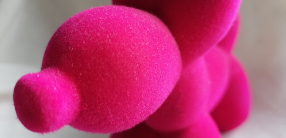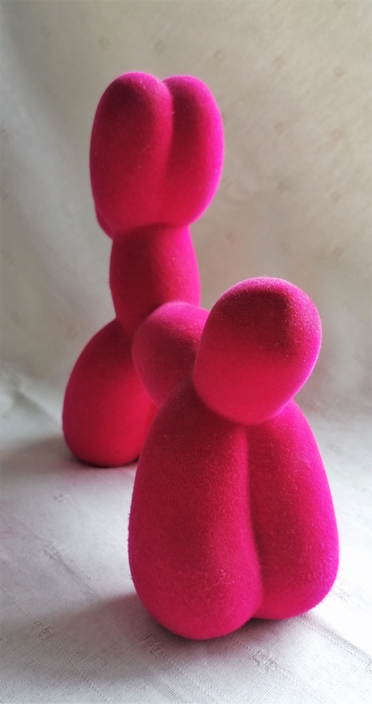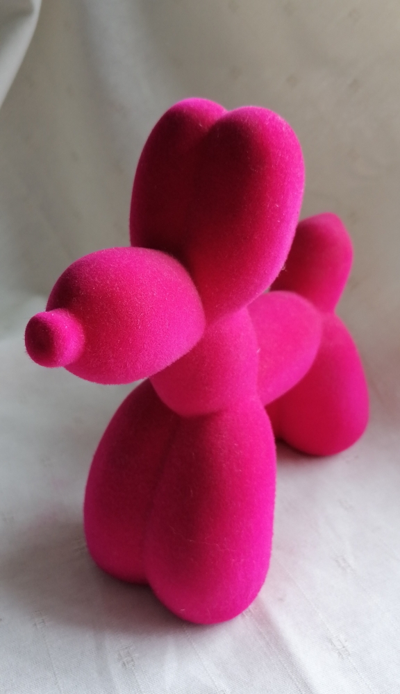 Jeff Koons (1955) After Balloon Dog Pink Het beeldje is gemaakt van porselein overtrokken met fel neon roze velours. Afmetingen zijn ca, 20 x 19 x 8 cm Het is niet gesigneerd. In mooie conditie zonder schade.