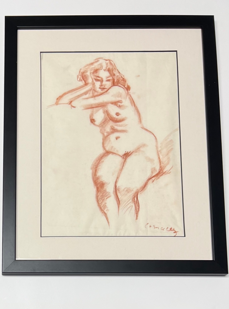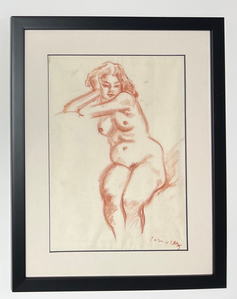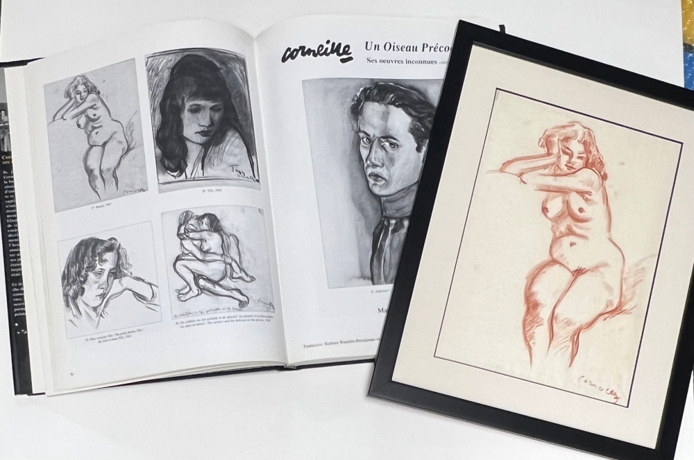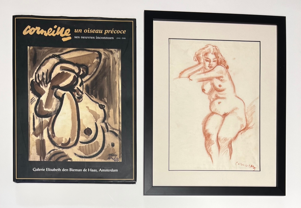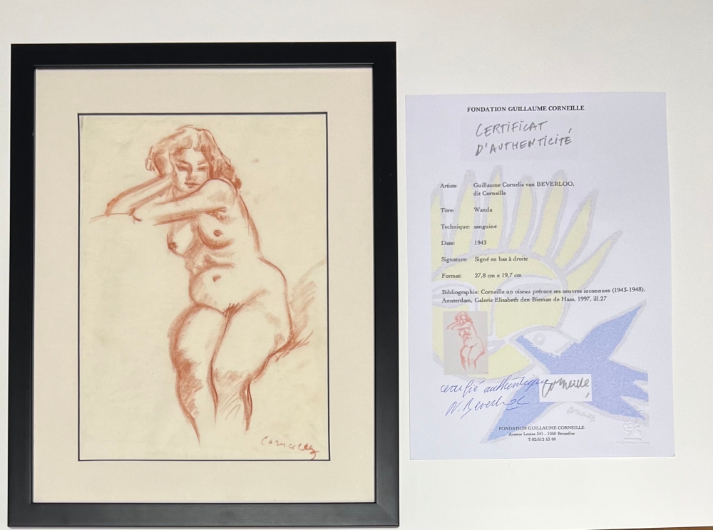 Sanguine op papier, gesigneerd en gedateerd rechtsonder, gerefereerd en gereproduceerd in het boek 'Corneille, een vroege vogel (1943-1948)' Galerie den Bieman de Haas, 1997, ill. 27. Prachtig origineel vroeg werk van de schilder op 21-jarige leeftijd, geleverd met certificaat van echtheid. Formaat met lijst: 39 x 31 cm, ca. Formaat van het werk: 27,8 x 19,7 cm. (Wij verkopen hier alleen het werk met certificaat) In Amsterdam bladert Guillaume Corneille door de zalen van het Rijksmuseum en bekijkt de grote namen in de schilderkunst. De vrouwenfiguren zijn vaak dromerig, geïmmobiliseerd in een opgeschorte tijd, dicht bij de naakten van Cézanne. Guillaume Corneille (1922-2010) werd in Luik geboren uit Nederlandse ouders en was lid van de Cobra-groep met Constant, Dotremont, Karel Appel, Asger Jorn, Noiret, Doucet en Alechinsky.