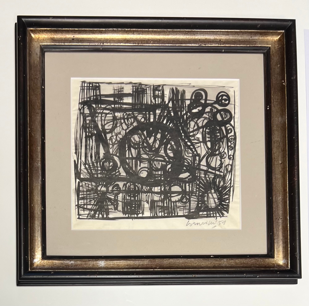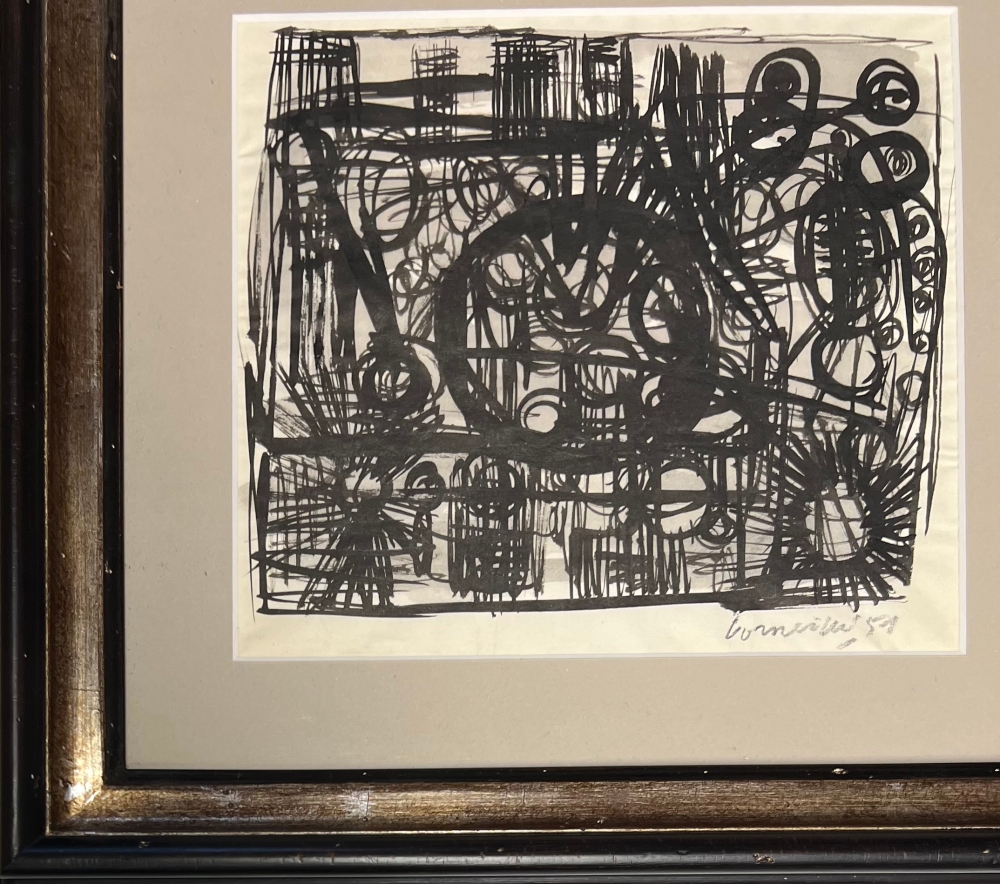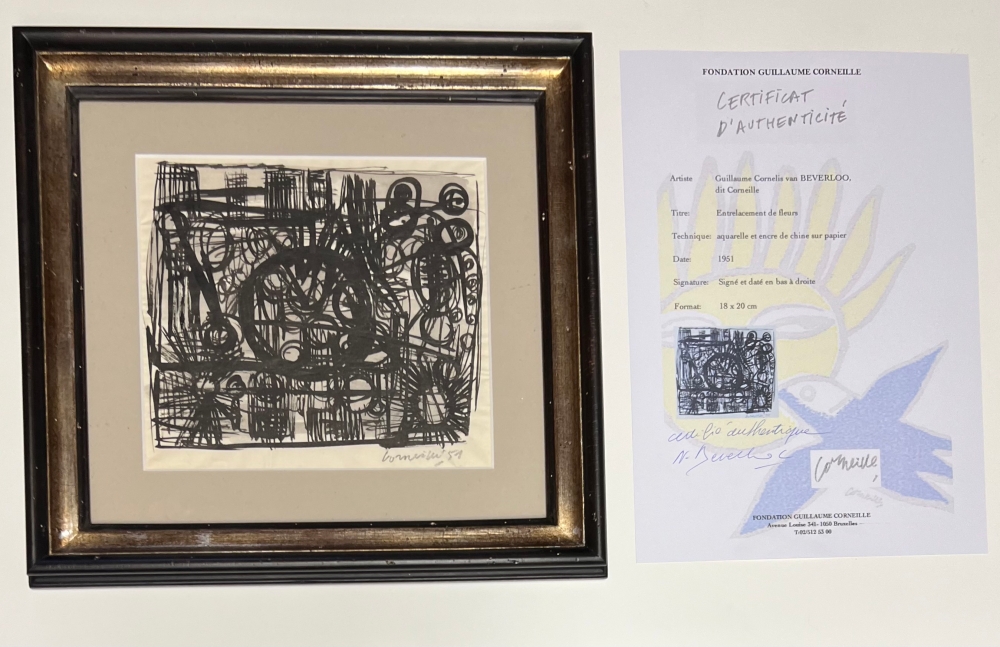 Aquarel en Oost-Indische inkt op papier, gesigneerd en gedateerd rechtsonder in grafiet. Mooi origineel werk, gerealiseerd door de schilder op 29-jarige leeftijd, geleverd met certificaat van echtheid. Formaat met lijst : 30 x 32 cm, ongeveer. Grootte van het werk : 18 x 20 cm. Een terugkerend thema van Guillaume Corneille is het 'spektakel van de natuur', een titel die hij aan verschillende van zijn werken toekende. Als in een ronde van de zon verstrengelen de bloemen zich, in een kruising van het plantaardige en het minerale, kleine en buitengewone schouwspel, waarvan Van Gogh de woordvoerder was door zijn draaiende sterren. In zijn abstractie genaamd "in ontkieming" (de term is van de kunstcriticus Charles Estienne), als een plant die ontkiemt, komen de figuren tevoorschijn en onthullen zich geleidelijk. De kunst van Guillaume Corneille is altijd een verhalende kunst. Guillaume Corneille (1922-2010) werd in Luik geboren uit Nederlandse ouders en was een van de leden van de Cobra-groep met Constant, Dotremont, Karel Appel, Asger Jorn, Noiret, Doucet en Alechinsky.