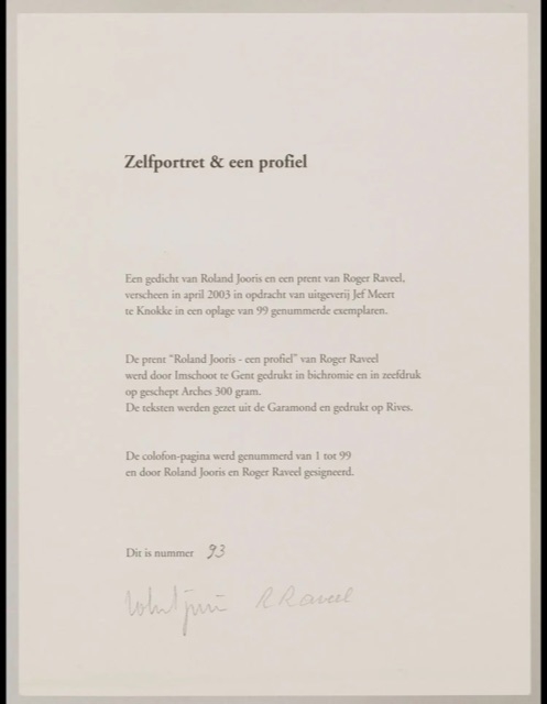 Gedicht door Roland Jooris en litho door Raveel. Door beiden gesigneerd in potlood Professioneel ingekaderd. 3 x (32 x 24 cm) en met lijst 92 x 92 cm. Roger RAVEEL (Machelen 1921 - Deinze 2013) graficus, schilder, tekenaar Opleiding: Roger Raveel volgde meerdere kunstopleidingen: Stedelijke Academie van Deinze en de Koninklijke Academie voor Schone Kunsten van Gent. Daarnaast is hij in de periode 1960-1973 docent geweest aan de academie van Deinze. Roger Raveel heeft zijn hele leven in Machelen -aan-de-Leije gewoond en gewerkt.