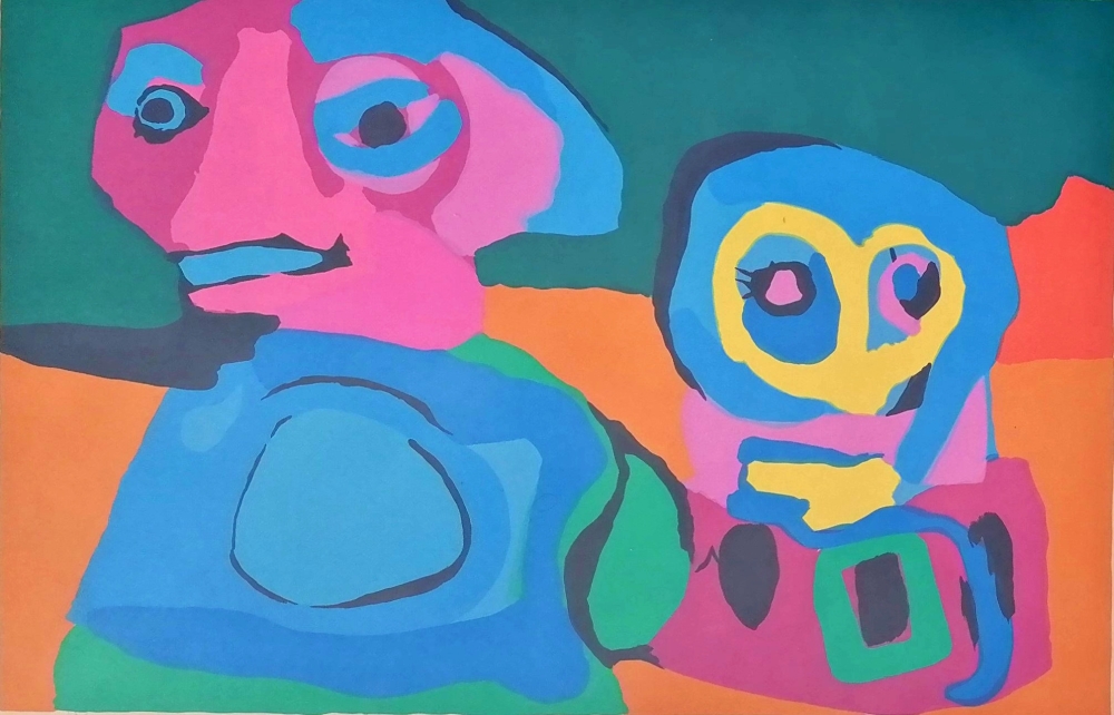KAREL APPEL (1921-2006) Twee abstracte figuren. Mooie zeer grote en zeldzame lithografie uit 1970 Gesigneerd en gedateerd rechts onder door de kunstenaar. Afmetingen zijn 72 x 105 cm In een zwart kader onder plexi- glas waarvan de totale maten 101 x 131 zijn.