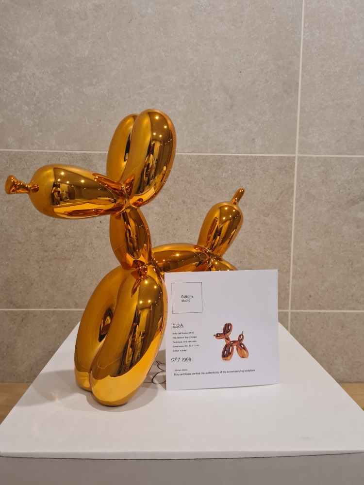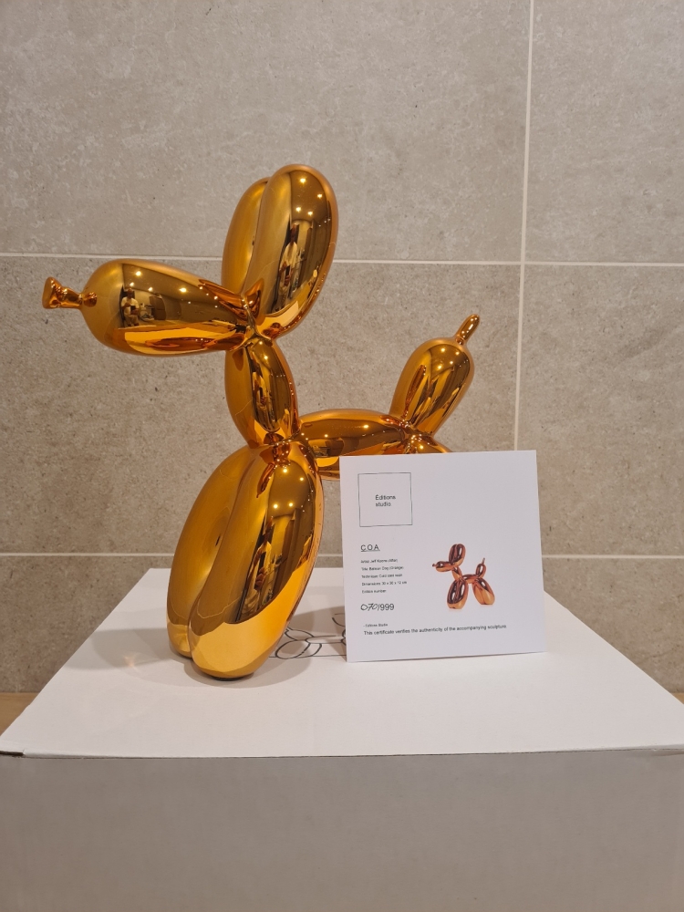 Balloon Dog in 'ORANGE'. Originele verpakking en certificaat aanwezig. Dit is de eerste zeldzame uitgave gelimiteerd op 999 stuks wereldwijd. Dit is nr. 71. Zorgvuldige, snelle en verzekerde verzending. Meer info: Jeffrey Jeff Koons (geboren 21 januari 1955) is een Amerikaanse kunstenaar wiens werk wordt gedomineerd door de themas banaliteit en verleiding. Van de Balloon Dog heeft Jeff Koons een aantal gelimiteerde reproducties vervaardigd welke bij Kunsthuizen verkrijgbaar zijn. Nummer kan afwijken van de foto