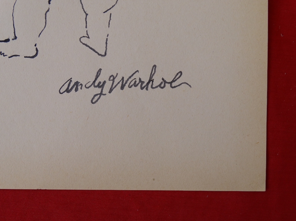 Andy Warhol, toegeschreven, inkttekening Andy Warhol was een Amerikaanse beeldend kunstenaar, regisseur en producer die een leidende figuur was in de beeldende kunstbeweging die bekend staat als popart. Zijn werken onderzoeken de relatie tussen artistieke expressie, reclame en de cultuur van beroemdheden die bloeide in de jaren 1960, en omvatten een verscheidenheid aan media, waaronder schilderkunst, zeefdruk, fotografie, film en beeldhouwkunst. Enkele van zijn bekendste werken zijn de zeefdrukken van Campbell's Soup Cans (1962) en Marilyn Diptych (1962), de experimentele films Empire (1964) en Chelsea Girls (1966) en de multimedia-evenementen die bekend staan ​​als Exploding Plastic Inevitable (1966-1967). ).