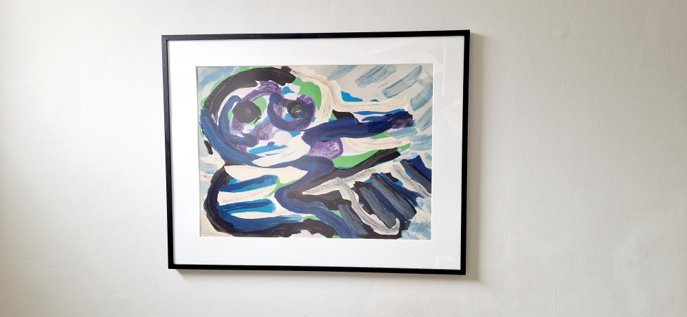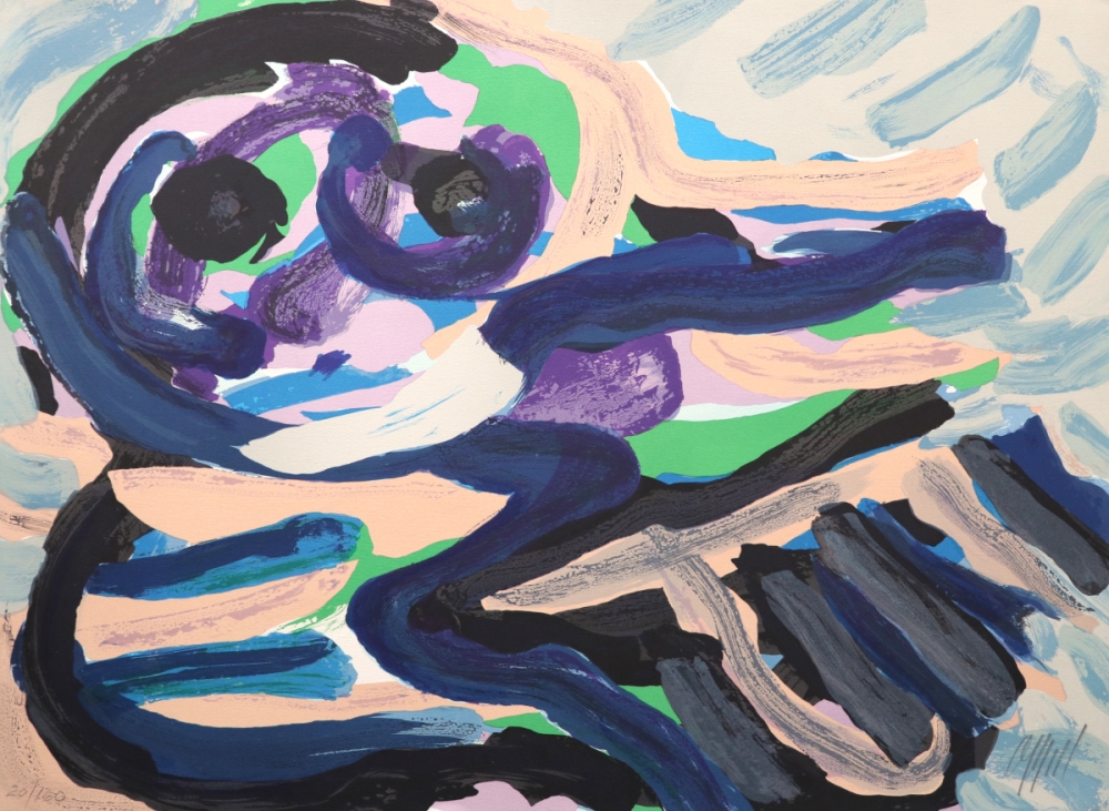 Zeefdruk van Karel Appel gedrukt in meerdere drukgangen. De zeefdruk werd uitgegeven op 160 exemplaren. Dit is een typerend werk uit de streepjes periode. Deze periode werd gevormd door zijn verblijf in Amerika. Het werk is in prima staat en is ingelijst in ontspiegeld en UV-werend glas.