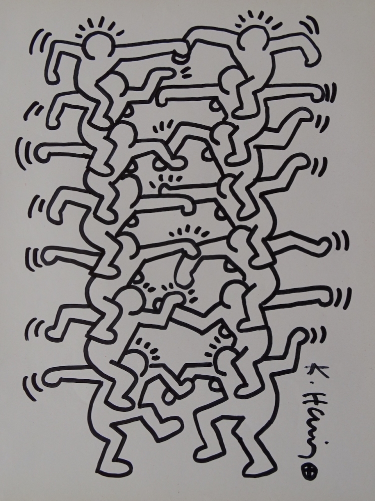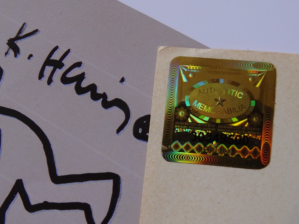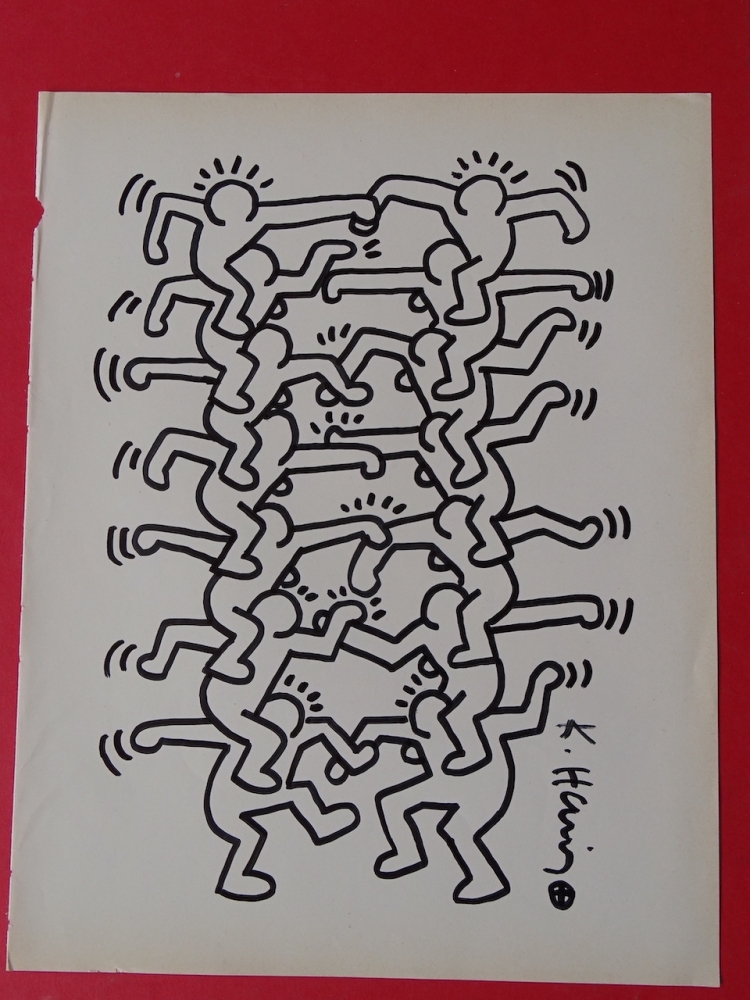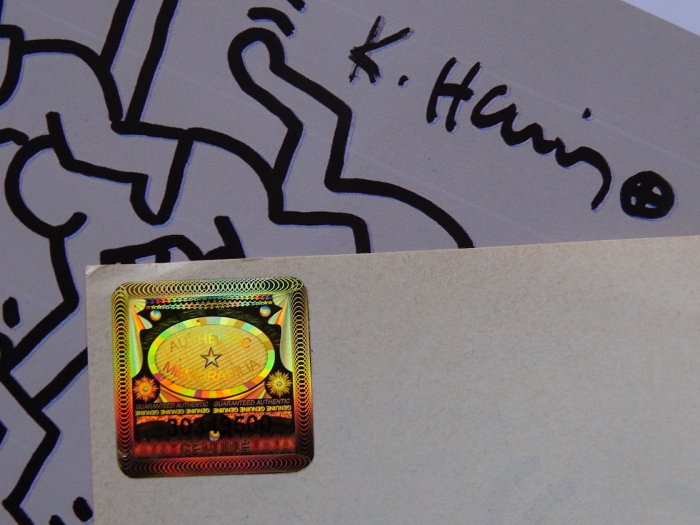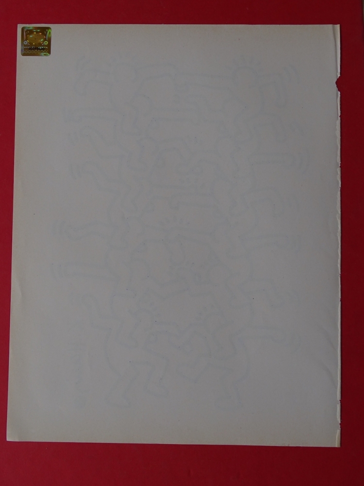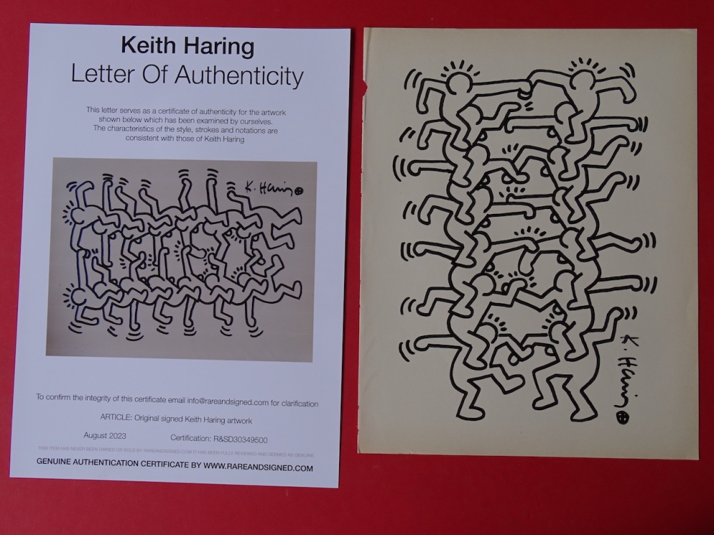 Keith Haring (toegeschreven), inkttekening, gesigneerd, met certificaat Keith Allen Haring (4 mei 1958 - 16 februari 1990) was een Amerikaanse kunstenaar wiens pop-art voortkwam uit de New Yorkse graffiti-subcultuur van de jaren 80. Zijn levendige beelden "werden een algemeen erkende beeldtaal". Veel van haar werk bevat seksuele insinuaties die zijn uitgegroeid tot sociaal activisme waarbij ze de afbeeldingen gebruikt om te pleiten voor veiligere seks en aids-bewustzijn. Naast individuele galerietentoonstellingen nam hij deel aan gerenommeerde nationale en internationale groepstentoonstellingen zoals de documenta in Kassel, de Whitney Biënnale in New York, de São Paulo Biënnale en de Venetië Biënnale. Het Whitney Museum hield in 1997 een overzichtstentoonstelling van zijn kunst.