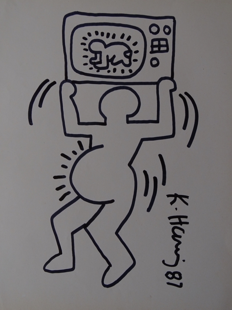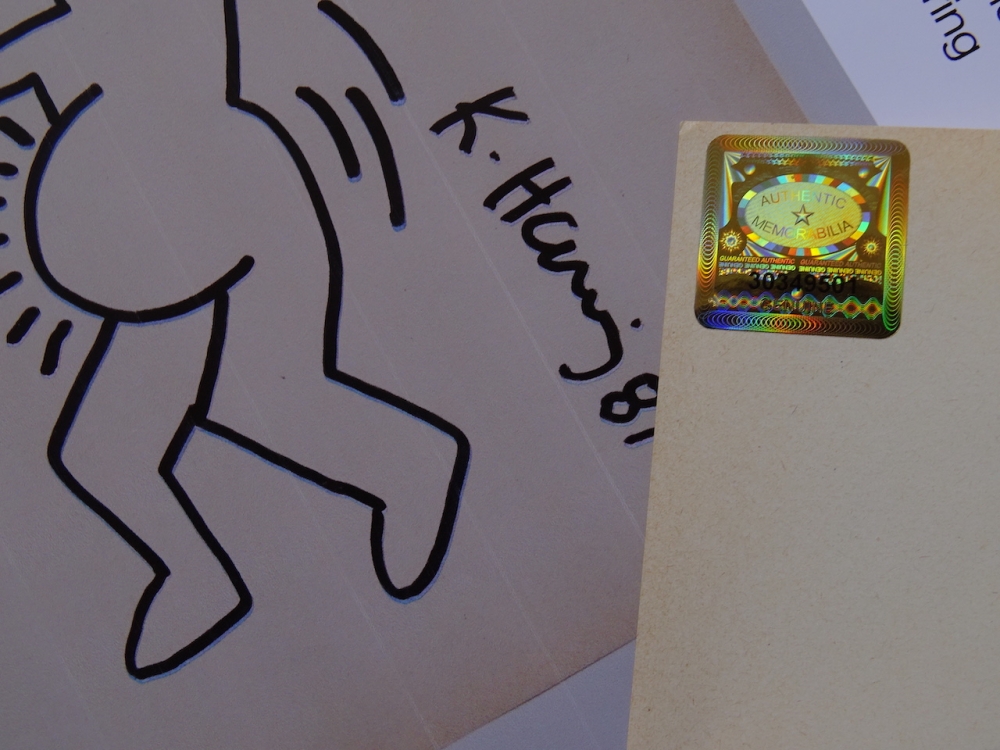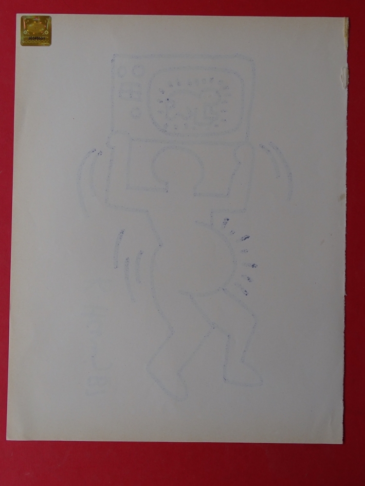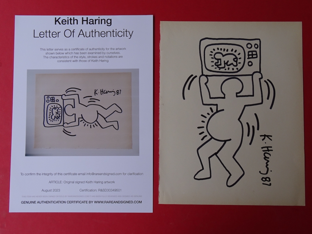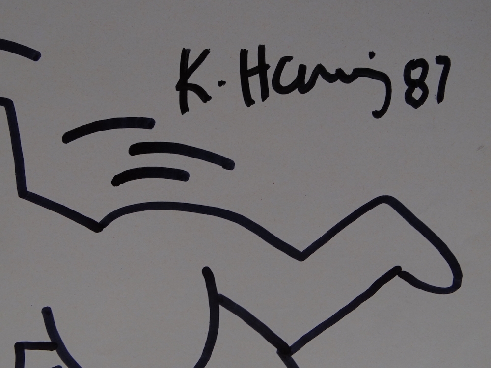 Keith Haring (toegeschreven), inkttekening, gesigneerd, gedateerd met certificaat Keith Allen Haring (4 mei 1958 - 16 februari 1990) was een Amerikaanse kunstenaar wiens pop-art voortkwam uit de New Yorkse graffiti-subcultuur van de jaren 80. Zijn levendige beelden "werden een algemeen erkende beeldtaal". Veel van haar werk bevat seksuele insinuaties die zijn uitgegroeid tot sociaal activisme waarbij ze de afbeeldingen gebruikt om te pleiten voor veiligere seks en aids-bewustzijn. Naast individuele galerietentoonstellingen nam hij deel aan gerenommeerde nationale en internationale groepstentoonstellingen zoals de documenta in Kassel, de Whitney Biënnale in New York, de São Paulo Biënnale en de Venetië Biënnale. Het Whitney Museum hield in 1997 een overzichtstentoonstelling van zijn kunst.