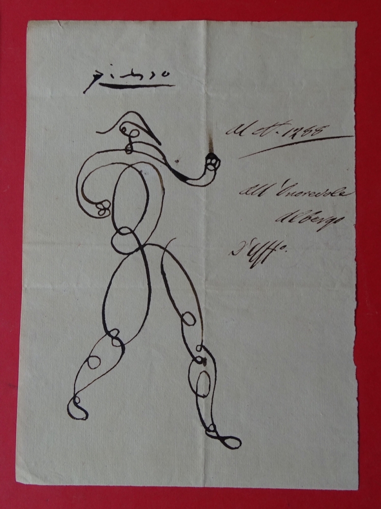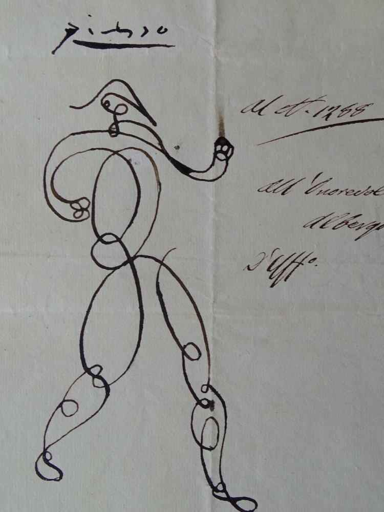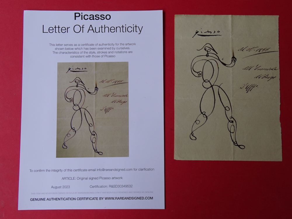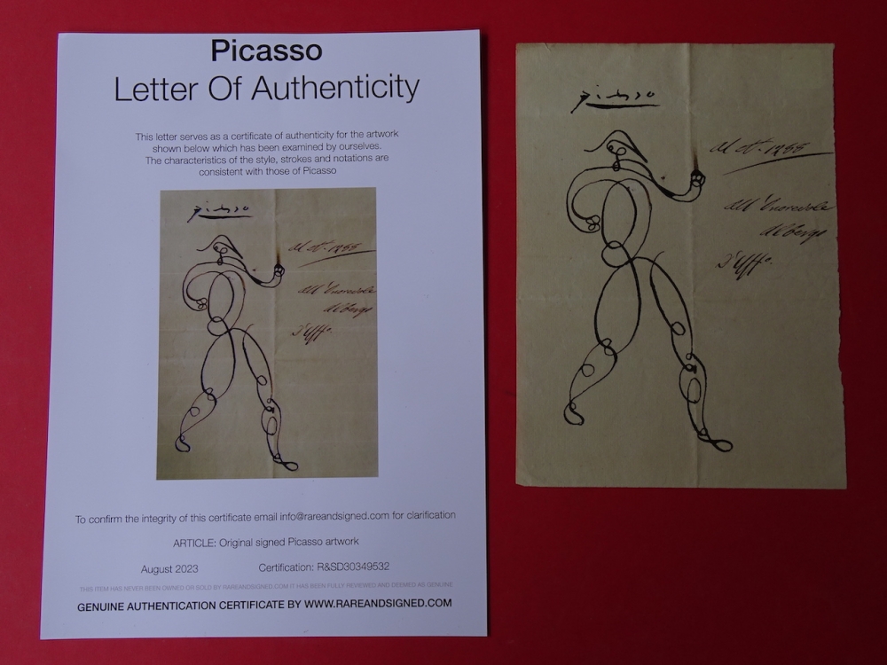 Inkttekening door Pablo Picasso (toegeschreven) Heel goede staat Echtheidsbrief inbegrepen. Hij wordt beschouwd als een van de meest invloedrijke kunstenaars van de 20e eeuw en staat bekend om zijn mede-oprichter van de kubistische beweging, het uitvinden van geconstrueerde sculpturen, het mede-uitvinden van collage en de grote verscheidenheid aan stijlen die hij heeft helpen ontwikkelen en verkennen. . Tot zijn beroemdste werken behoren het proto-kubistische Les Demoiselles d'Avignon (1907) en het anti-oorlogsschilderij Guernica (1937), een dramatische weergave van het bombardement op Guernica door de Duitse en Italiaanse luchtmacht tijdens de Spaanse Burgeroorlog.