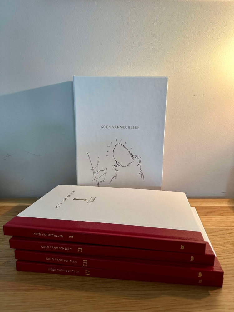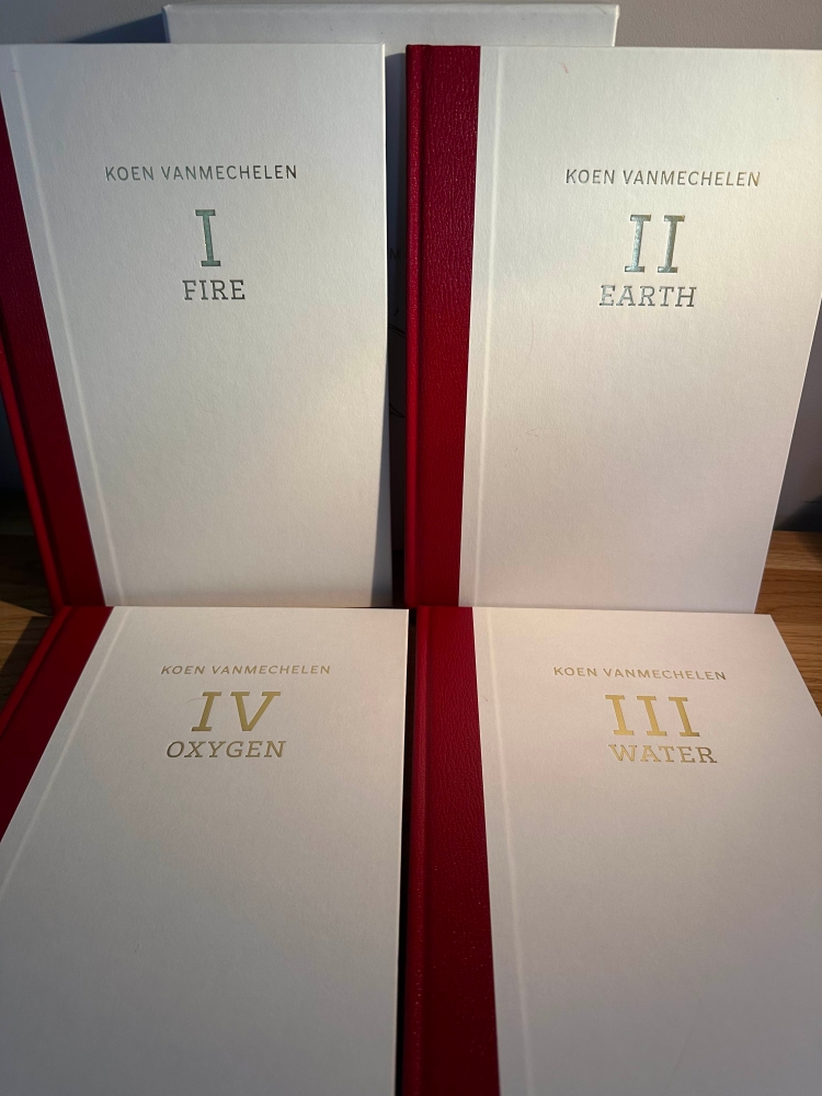 Box met 4 boeken - HANDGESIGNEERD EN MET ORIGINELE GROTE TEKENING VAN KOEN VANMECHELEN. Box The elements of life bestaat uit 4 delen: Fire - Earth - Oxygen - Water Uitgegeven door Foundation Pieters. Zeer mooie uitgave over het recente werk van Koen Vanmechelen met enkele teksten en vooral mooie illustraties. Per boek +/- 96 pagina's - in vrijwel nieuwe staaT! Harde kaft. UNIEK OBJECT.
