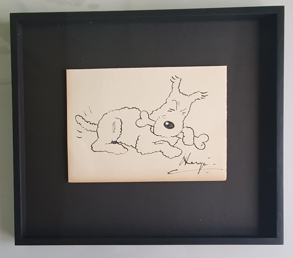 HERGÉ (1907-1983) Tekening van Bobbie (Milou) met bot, in inkt op papier. De tekening is gesigneerd rechts onderaan. Het werk is zwevend ingelijst met ontspiegeld en uv-werend glas en een mooie zwarte lijst. Originele tekeningen van Hergé worden zelden op veiling aangeboden. De prijzen van dergelijke tekeningen gaan dan ook zeer hoog. Unieke kans om dergelijk werk op de kop te kunnen tikken.