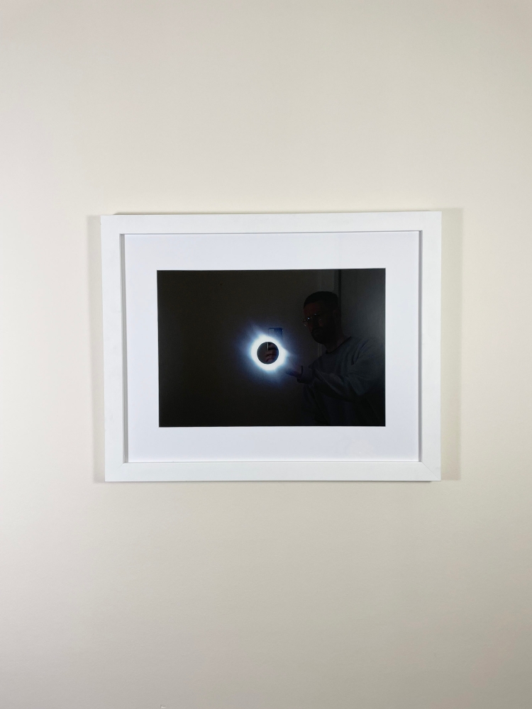 Ingekaderde fotolitho van zonne eclips van de hand van Ann Veronica Janssens uit 2013. Dit werk is gemaakt in een reeks van 4 en ze worden alle vier afzonderlijk aangeboden. Het werk is handgenummerd door de kunstenaar (zie foto). Ann Veronica Janssens (B, 1956) is een internationale beeldhouwer van het licht, van het geluid en van de ruimte. Ann Veronica Janssens gaat bijna altijd op minimale wijze te werk zonder echt bij de minimal art te horen. Dat haar werk echter wel eens met de minimalistische stroming in verband wordt gebracht komt door de heldere vormgeving en de materiaalkeuze: transparant, glanzend of juist verdicht en schijnbaar ontoegankelijk. De kunstenaar woont en werkt in Brussel. De foto komt uit de reeks 'Museum to scale' uitgegeven door gallerist Ronny Van de Velde. Het geheel wordt vakkundig ingepakt en opgestuurd.