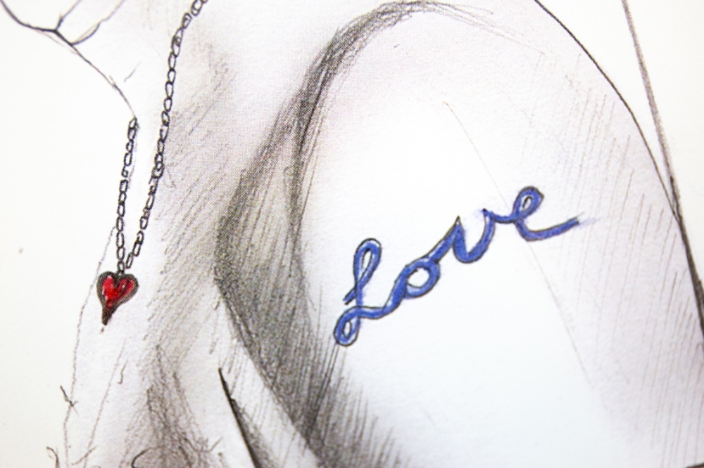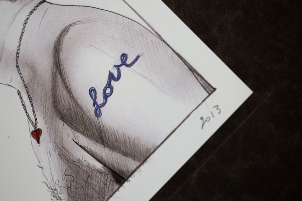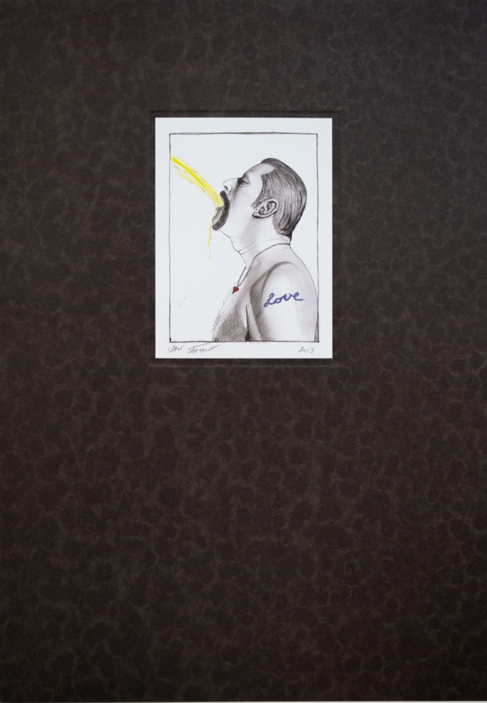 Grafisch werk van Jan Fabre's bijdrage aan de "Museum to Scale"-exhibitie van Ronny Van de Velde uit 2013: "Sex", "Love" en "Art". Het werkje is gemonteerd op een zwarte kartonnen plaat van 35cm op 50cm. Het kaartje zelf is 12,5cm op 17cm.
