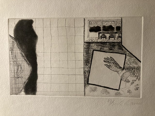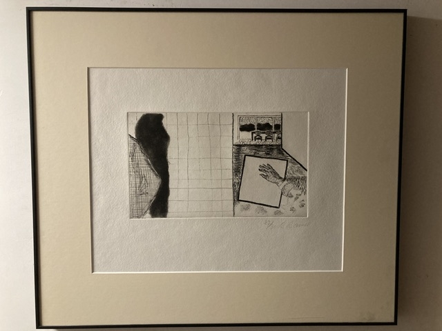 Mooie ets in kleine oplage gedrukt door Piet Clement en uitgegeven door printshop amsterdam. De ets geeft het interieur weer van roger raveel met de bekende stoelen van veranneman. Ingekaderd en met passe-partout.
