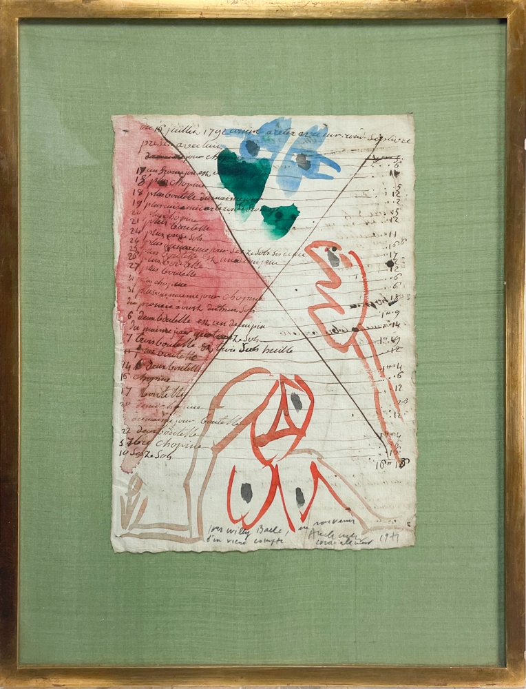 Origineel schilderij op oud waarde papier van Alechinsky. Werken op oud waarde papier is enorm typerend voor Alechinsky. Het werk is onderaan gesigneerd en gedateerd in potlood. Het werk is ingelijst in een houten kader.