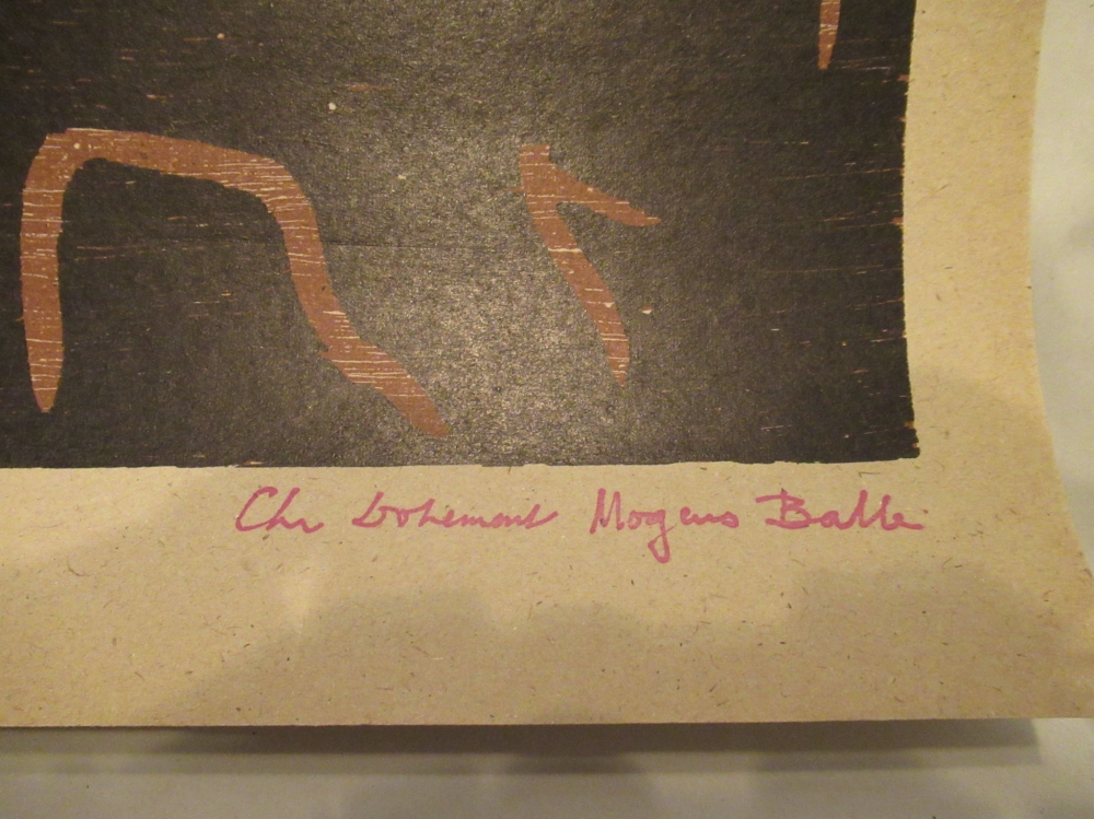 Dit betreft een perfecte houtsnede gedrukt kraft van CoBrA artiesten Christian Dotremont & Mogens Balle. Deze is in perfecte staat en betreft een proefdruk. Gesigneerd in druk. Afmetingen: 62 x 42cm Tot de CoBrA beweging behoorden ook Pierre Alechinsky, Karel Appel, Corneille & Bengt Lindström.