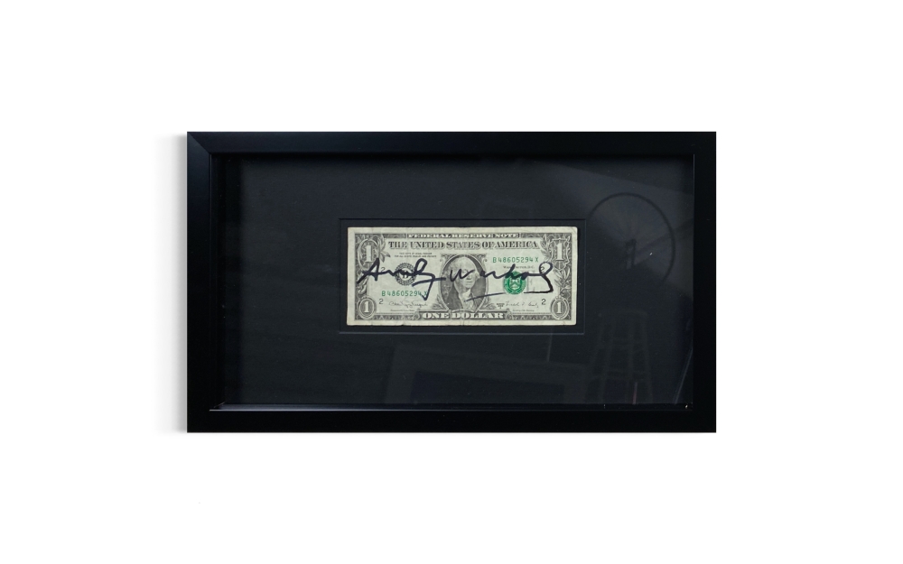 Dollar biljet van 1 dollar hand gesigneerd door Amerikaans kunstenaar Andy Warhol met zwarte stift. Professioneel ingelijst in zwarte kader. Verzekerde verzending alsook ophaling mogelijk.