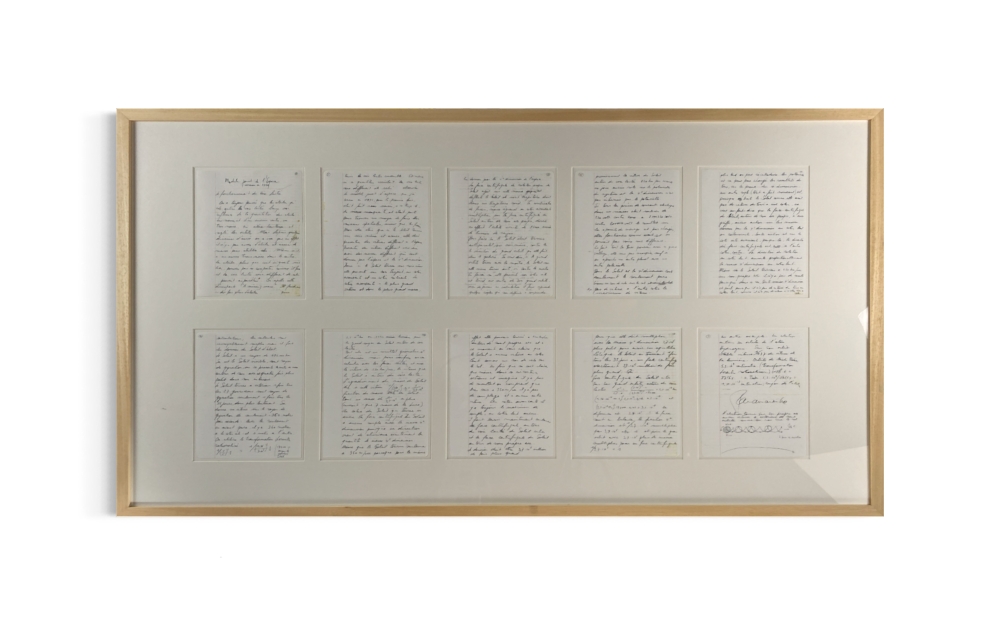 Facsimile van het manuscript dat Panamarenko schreef voor zijn ‘Toymodel of Space’. Professioneel ingelijst in houten kader waarbij elk blad in passe-partout werd uitgesneden. Verzekerde verzending alsook ophaling mogelijk. (Enkel binnen België)