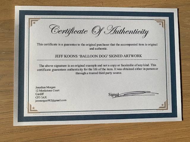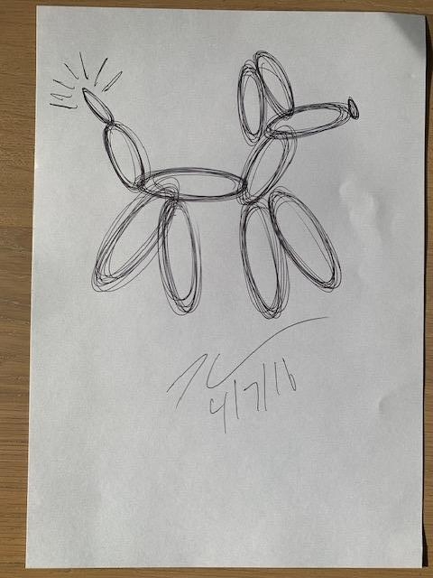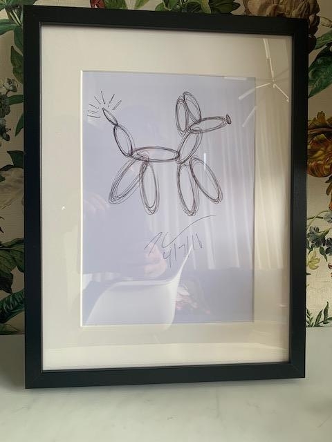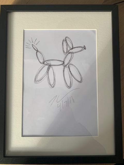 Balloon Dog door Jeff Koons Een mooie tekening door Jeff Koons, materiaal viltstift op papier. Ondertekend en gedateerd 11/9/2014. Jeff Koons is samen Andy Warhol en Micael Basquiat een van de grondleggers van de pop art. Het werk is ingelijst, afmeting 30 x 40 cm, werk zelf 20 x 30 cm. Deze tekening is voorzien van een certificaat van echtheid, Afkomstig uit Engelse prive verzameling. Het werk is voorzien van hologram achterop.