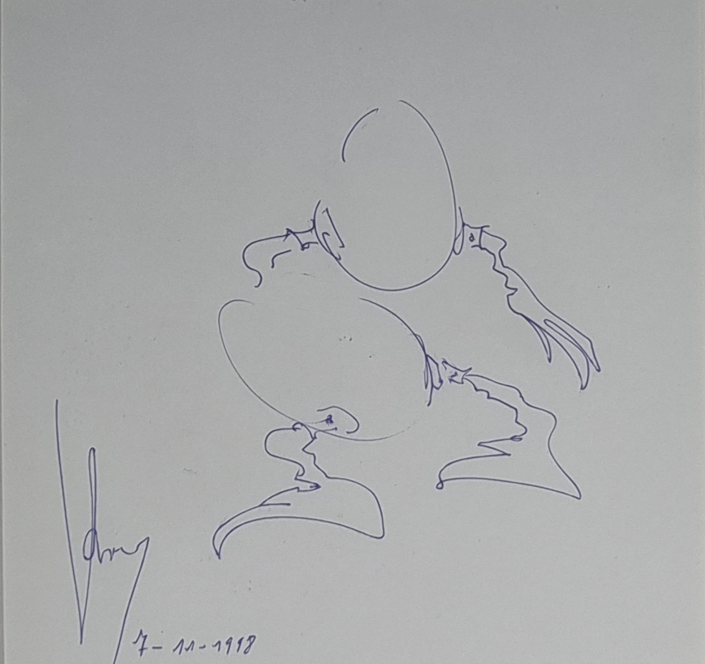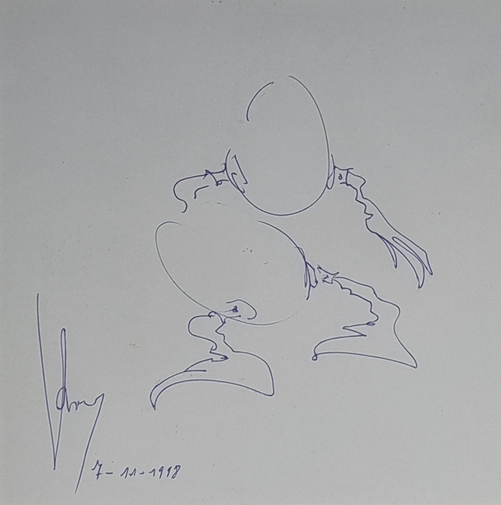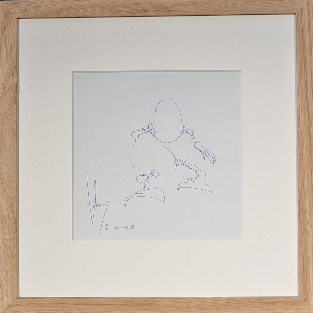 Originele tekening met balpen van Koen Vanmechelen. Het werk "The Walking Egg" is gesigneerd en gedateerd door de kunstenaar. Eveneens professioneel ingelijst in een eiken kader en museumglas, kan zo aan de muur.
