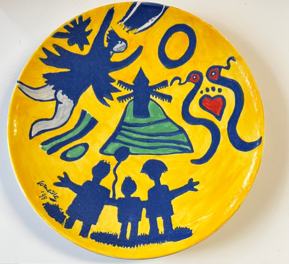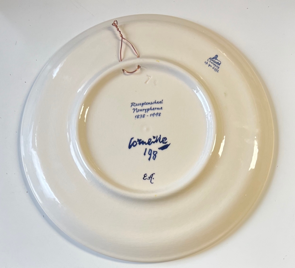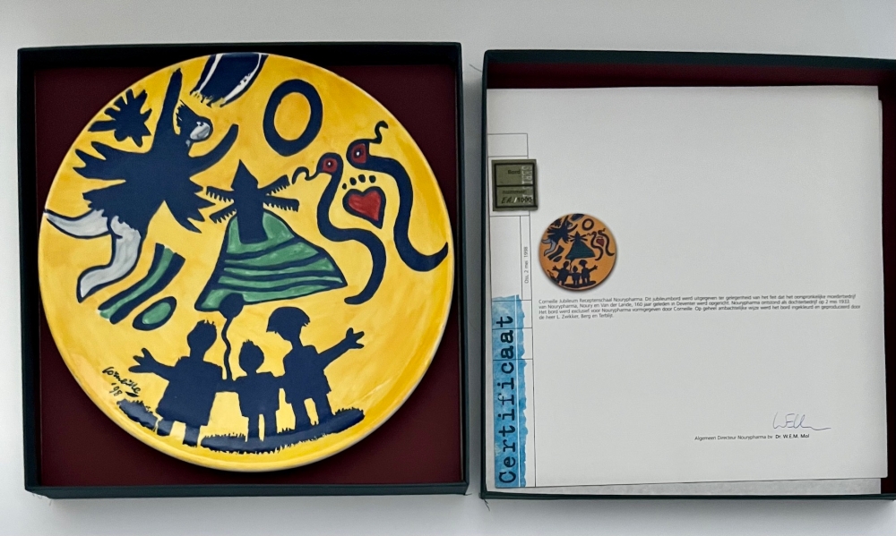 Schitterende keramische schaal gemaakt in 1998 voor het jubileum van Nourypharma. Capsule creatie, 1998. E/A-exemplaar geleverd met originele doos en certificaat. Guillaume Corneille verbeeldt hier de caduceus van de farmaceutische groep (als knipoog naar de Cobra-slang 50 jaar geleden) en het molensymbool van de Nederlandse folklore. Keramiek gesigneerd en gedateerd in het linkerpaneel vlakbij de rand. 33,5 cm in omtrek - Met haakje aan de achterkant voor bevestiging. Dit jaar is het 100 jaar geleden dat Corneille (1922-2010) werd geboren in Luik uit Nederlandse ouders. Hij was een van de oprichters van de Cobra-groep, samen met Karel Appel, Dotremont, Constant, Asger Jorn, Joseph Noiret, Lucebert en Alechinsky. Retrospectieve tot 15 januari in het Cobra Museum in Amstelveen, en release van een Cobra en Cornelius verzamelpostzegel in januari 2023 door Bpost.