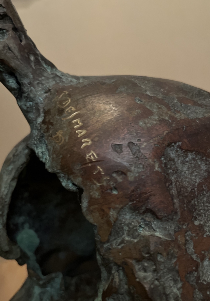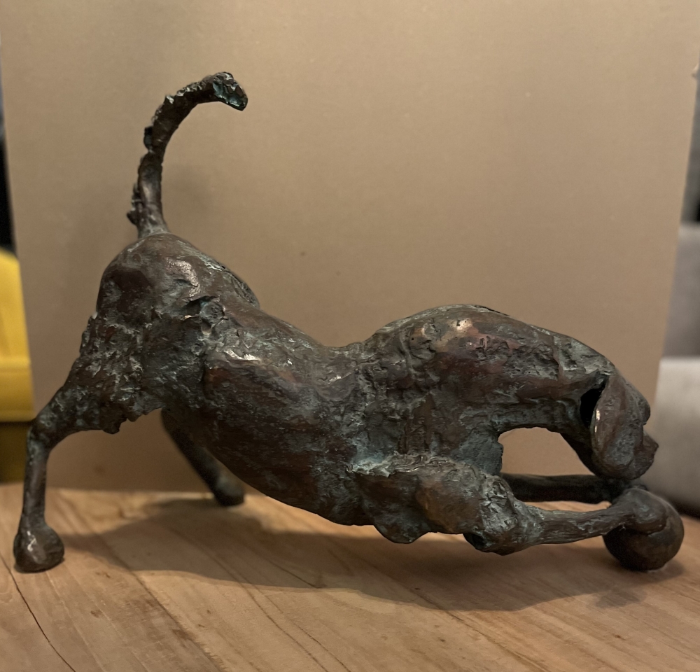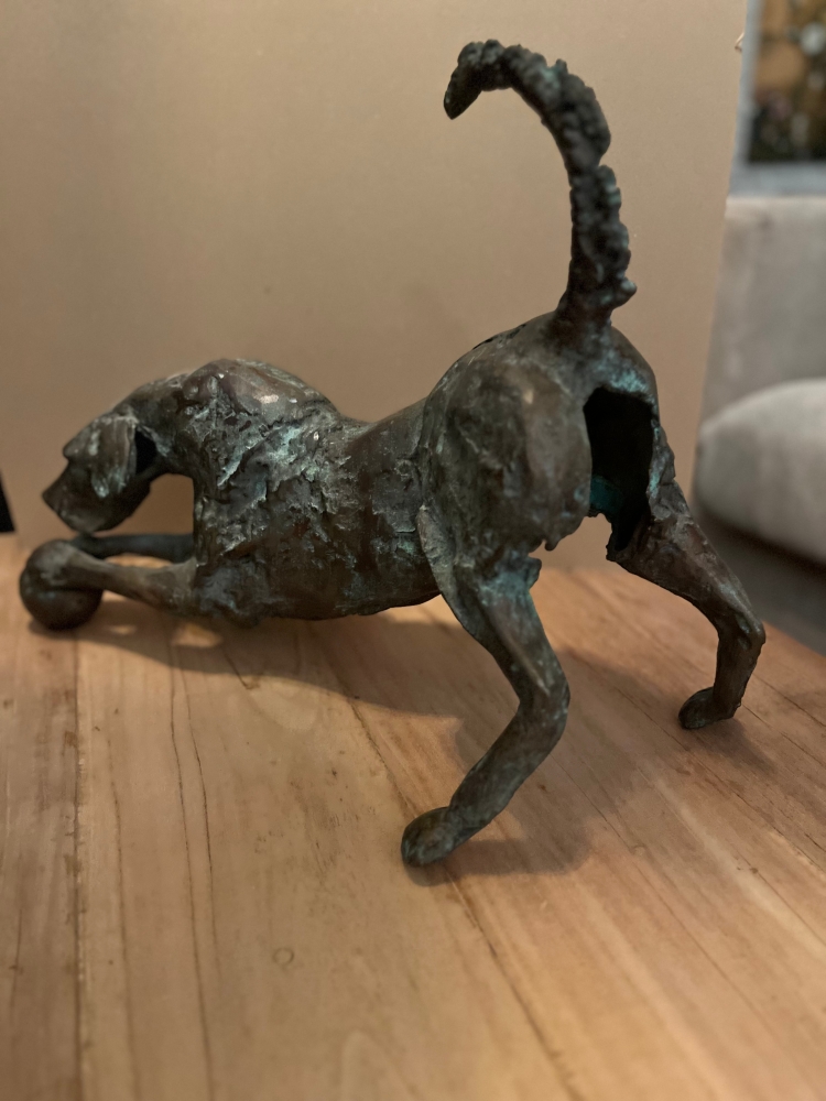 Bronzen beeld van een spelende hond, gesigneerd. Jan Demarets verbeeldt iets passioneels in zijn weergave van dieren, hij weet een bepaalde levensvreugde over te brengen in zijn sculpturen. Jan Demarets is onder meer bekend van het standbeeld van het Ros Beiaard in het centrum van Dendermonde.