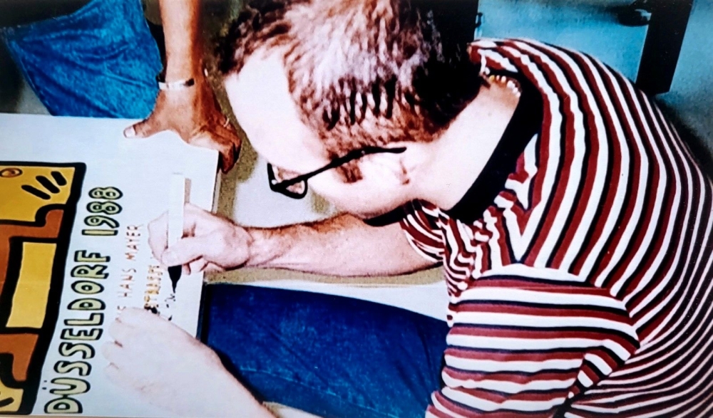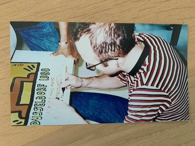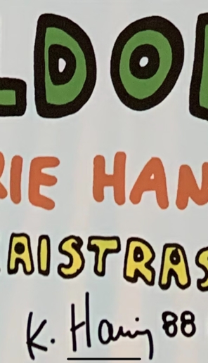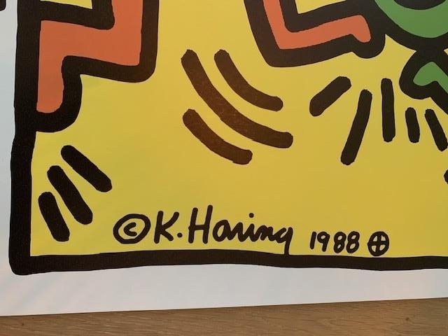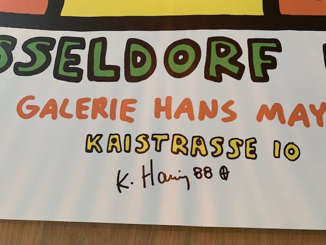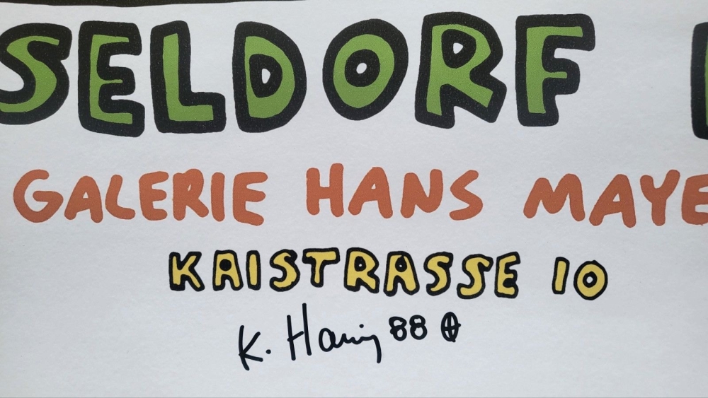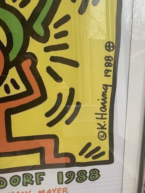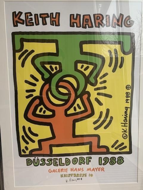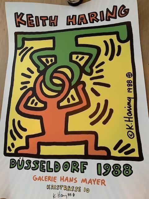 Zeer zeldzame originele druk van een van de laatste Keith Haring tentoonstellingen in Galerie Hans Mayer in Düsseldorf 1988. Afmetingen : 84 x 59 cm, 33 x 23 inch. Deze zeer gelimiteerde tentoonstellingsposter werd gezeefdrukt op dik papier van zeer hoge kwaliteit. Dit kwaliteitsniveau is niet te vergelijken met de kwaliteit van de vele eerdere Keith Haring posters die in offset op zeer dun papier werden gedrukt. De kleuren zijn sterk door het zeefdrukproces en geven het werk een indrukwekkende uitstraling. Deze poster is door Keith Haring gesigneerd tijdens de vernissage. De originele foto waarop te zien is hoe Keith Haring deze poster signeerde wordt meegeleverd. Keith Haring was samen met Andy Warhol en Basquiat de grondleggers van de pop-art. Zeer exclusief en uniek werk!