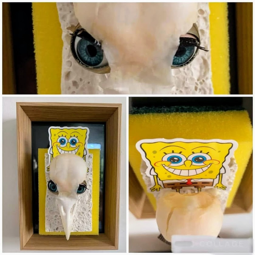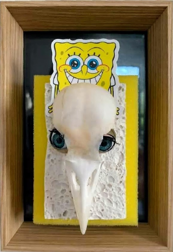 Assemblage met Objet Trouvé - Veronique verwerkte een vogelschedel op een porseleinen sponsje, op een afwasspons. In de schedel heeft ze poppenogen gezet. Ze werkt met Objet Trouvé en heeft thuis een grote verzameling objecten met esthetische en/of historische waarde. Ze gaat op haar gevoel af en maakt hiermee nieuwe samenstellingen die tot de verbeelding spreken.