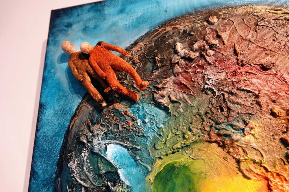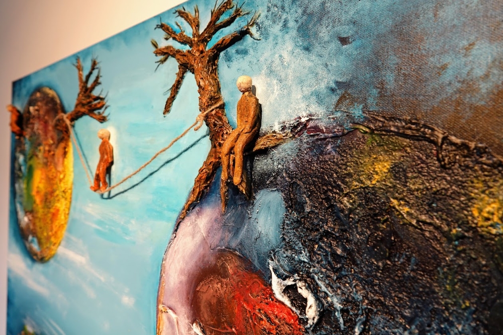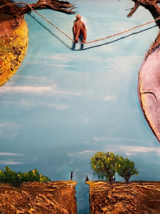 Acryl en mixed media op canvas - Ann wordt progressief slechtziend door glaucoom. Ze ervaart het voortdurend balanceren tussen hoop en wanhoop. Het figuurtje op haar kunstwerk balanceert op het slappe koord tussen de wereld van de zienden en de wereld van de mensen met een visuele beperking. De wereld van de zienden is helder van kleur. De wereld van de mensen met slecht zicht is donkerder, hier en daar onzichtbaar. Op deze planeet zit een mannetje neer, want mobiliteit wordt sterk aangetast. Het balancerende figuurtje ervaart onder zich een ravijn. Af en toe lijkt het alsof ze gaat vallen. Goede vrienden staan echter klaar om haar op te vangen. Ann koos ervoor om een 3D-werk te maken. Het moest een voelbaar kunstwerk worden, zodat de mensen met slecht zicht ook kunnen ervaren wat er verbeeld wordt. Echter, niet alles is in 3D, want niet alles is tastbaar. Er zullen altijd elementen zijn die de persoon met een visuele beperking niet kan waarnemen, dat is een groot gemis.