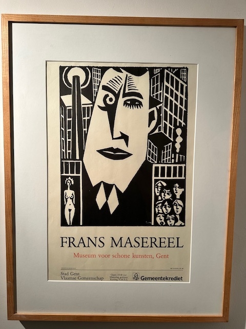 Zeer zeldzame affiche voor de tentoonstelling van Frans Masereel in het Museum voor Schone Kunsten te Gent. Georganiseerd in 1986 van 26/6 tot 14/9 De affiche i ingelijst in een stevig houten kader.