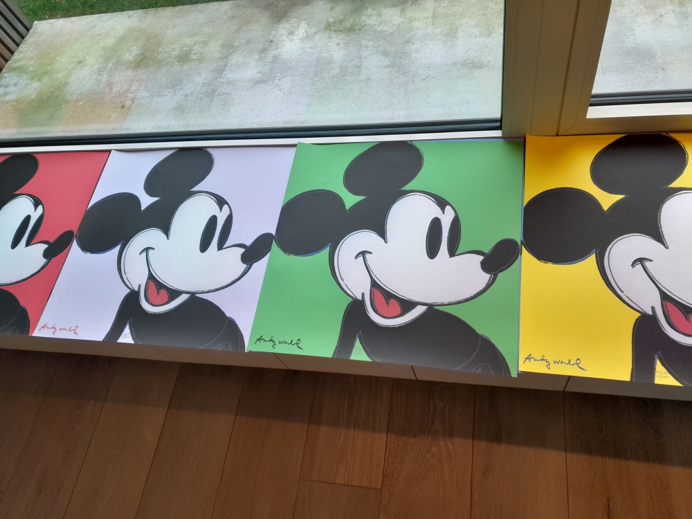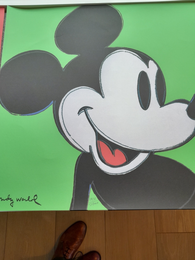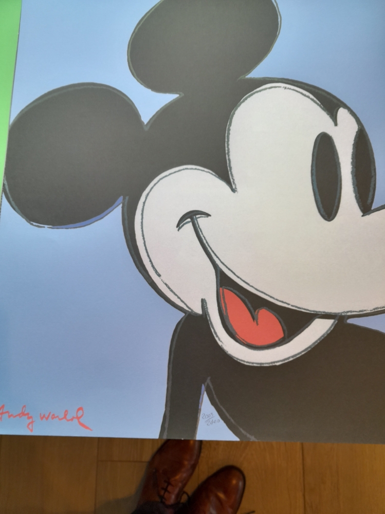 Popart, bekende Micky Mouse reeks van Andy Warhol. Getekend en met hand genummerd. Reeks van 5 stuks van 60x60cm. Voorzien van stempel CMOA (Carnegie Museum of Art in Pittsburgh). Passende in de reeks met Elvis en Marilyn Manroe waarmee hij aangaf voor hem Mickey een echte ster was. Zeldzaam in reeks.