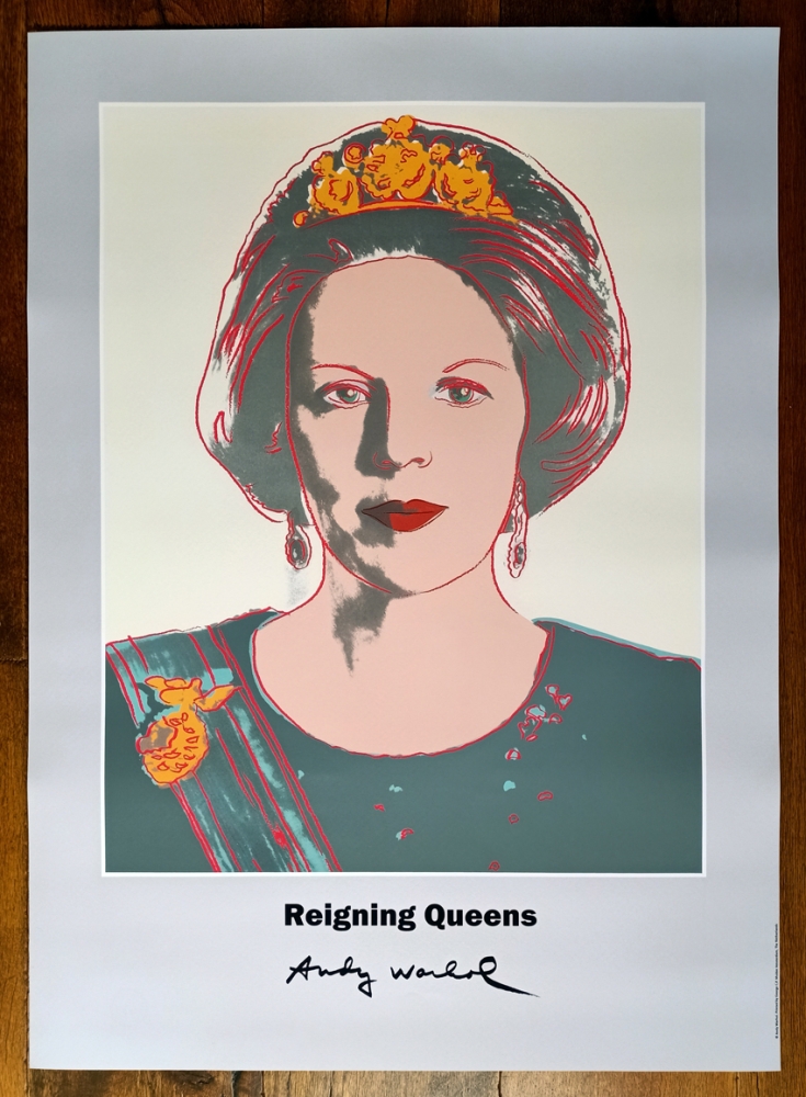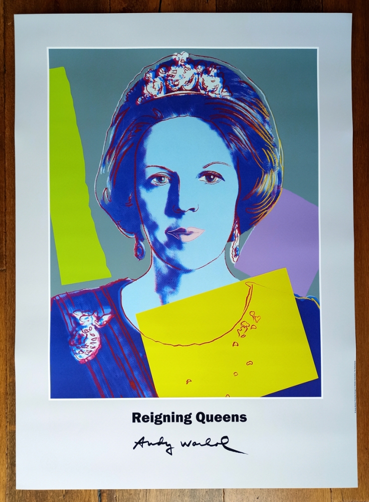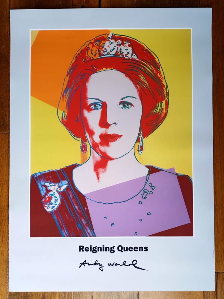 Andy Warhol Portfolio Posterprint Viertal 'Reigning Queens (Beatrix)' 1986 (#0427) Andy Warhol-tentoonstellingsposter. Deze poster toont Koningin Beatrix uit haar portfolio "Reigning Queens" uit 1985. Het was een eerbetoon aan de empowerment van vrouwen, aangezien koninginnen hun tronen innamen op basis van geboorterecht en niet op basis van huwelijk. Afmetingen: 60x82 cm. Techniek: Offsetlithografie, papiersoort: fijn gecoat papier In uitstekende staat. Handtekening: Ondertekend in druk. Gedrukt in 1986 voor Art Expo Denemarken. Op de achterkant gestempeld met de Andy Warhol Foundation. De foto's maken deel uit van de omschrijving, bekijk de foto's om zelf te beoordelen in algemene staat. Word veilig verpakt en wereldwijd verzonden.