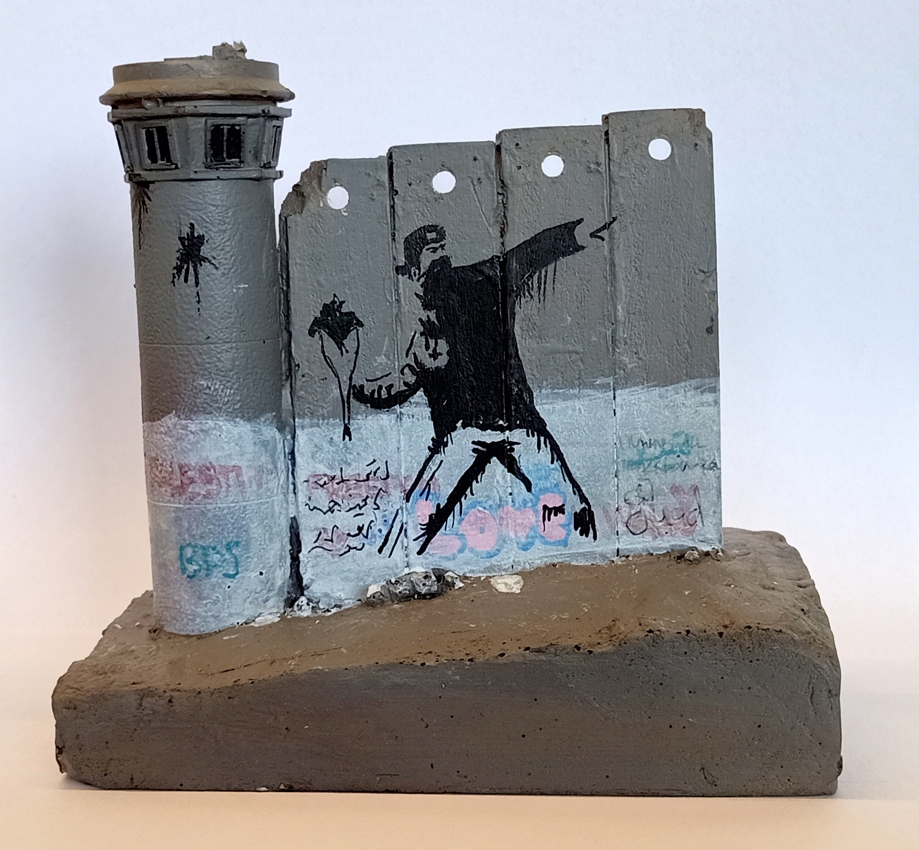 Banksy (toegeschreven) Free Palestijnse Sculpture met aankoopbewijs (#0536) Ultra zeldzame 5 stuks inclusief Turret, gemaakt met eigen basis. Ontvangstnummer en artikelnummer: 2000113 4D. Afmeting: 13x13x8cm. Wordt geleverd met een originele genummerde hotelbon en visitekaartje. Het beeld is met de hand beschilderd door lokale Palestijnse ambachtslieden, gegoten in giethars. Dit stuk is - en zal - ZEER verzamelbaar zijn, en deze souvenirsculpturen uit het wandgedeelte zijn nu UITVERKOCHT. Dit kunstwerk was alleen te koop in het Banksy Hotel in Bethlehem, Palestina en is uniek in zijn soort. Er zijn slechts zeer weinig exemplaren van dit kunstwerk gemaakt. Banksy's Walled Off Hotel-sculpturen zijn souvenirs bedacht en ontworpen door Banksy en gemaakt door lokale ambachtslieden. Gemaakt in een ongenummerde gelimiteerde oplage. UITGEPUT!! The Walled Off Hotel is een boetiekhotel ontworpen door de anonieme Londense kunstenaar Banksy samen met andere creatievelingen. Het is gelegen in Bethlehem, 40 kilometer (25 mijl) van de luchthaven Ben Gurion. Het hotel, opgericht in maart 2017 en aanvankelijk bedoeld als slechts een tijdelijke tentoonstelling, heeft sindsdien bijna 140.000 bezoekers getrokken, deels dankzij de ligging tegenover het gedeelte van de Israëlische Westelijke Jordaanoeverbarrière dat Bethlehem scheidt van de locatie van de heilige van Rachels tombe. Het hotel wordt gezien als een belangrijk sociaal commentaar op de Palestijnen die getroffen zijn door het Israëlisch-Palestijnse conflict en wordt aangeprezen als "het slechtste uitzicht van welk hotel dan ook ter wereld". De foto's maken deel uit van de omschrijving, bekijk de foto's om zelf te beoordelen in algemene staat. Wordt veilig verpakt, verzekerd en wereldwijd geregistreerd.