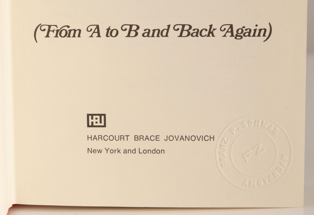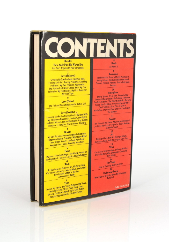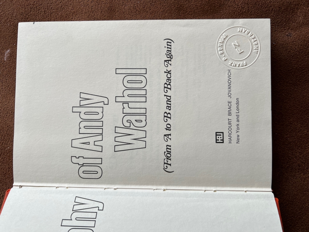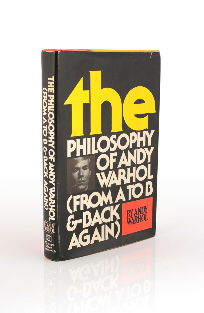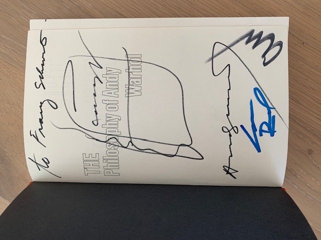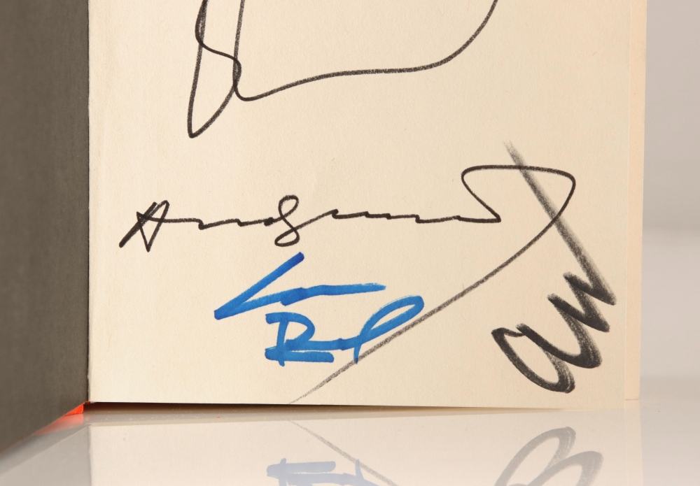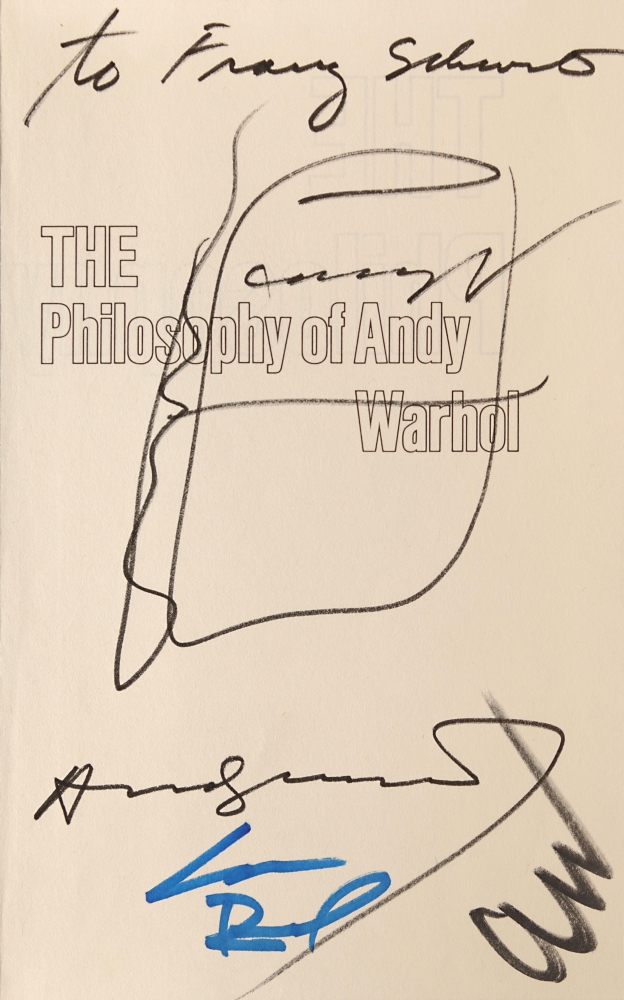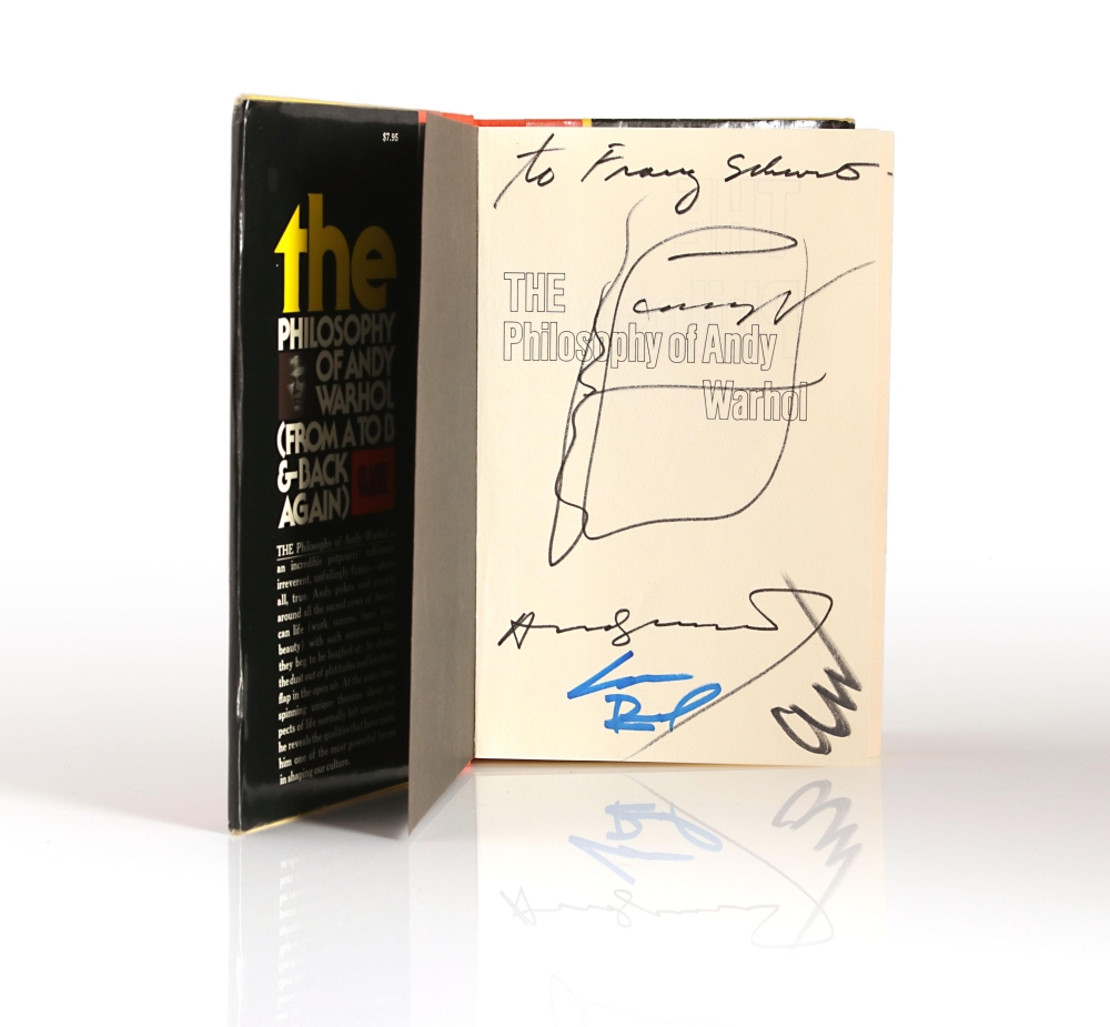 "De filosofie van Andy Warhol (van A naar B en weer terug)" Eerste editie. New York en Londen: Harcourt Brace Jovanovich, 1975. Dit exemplaar is gesigneerd "AW" Andy Warhol en door Lou Reed op de halve titelpagina in zwarte viltstift, Deze combinatie van 2 iconen is uniek. "To Franz Schwab, Andy Warhol", met een schets van zijn klassieke "Campbell's Soup" blikje toegevoegd. Dit is een unieke teekning van Andy Warhol. Hardcover met stofomslag, 15 x 21 cm. 241 pagina's. (Octavo.) Gebonden in originele oranje stof - gele platten met achterkant en geïllustreerde stofomslag. Op een van de pagina staat een druk waaruit blijkt dat dit exemplaar komt uit de collectie van Franz Schwab. Franz Schwab was midden jaren 70 een geweldige fan van Warhol én van LouReed. Hij was in NY met zijn oom Fred Schwab (balletdanser bij Nationaal Ballet), kreeg via hem de kans op een vernissage te zijn, en ze liepen daar tegen de beide heren aan. Ze bleken Fred te kennen. Had het boek net aangeschaft, kon de kans niet laten schieten om te laten ondertekenen door beide. Stempel in het boek bevestigd de herkomst. Een mail van Franz zal ik bijvoegen ter bevestiging van de echtheid. Een uniek exemplaar vanwege het ondertekenen door zowel Andy Warhol als Lou Reed!