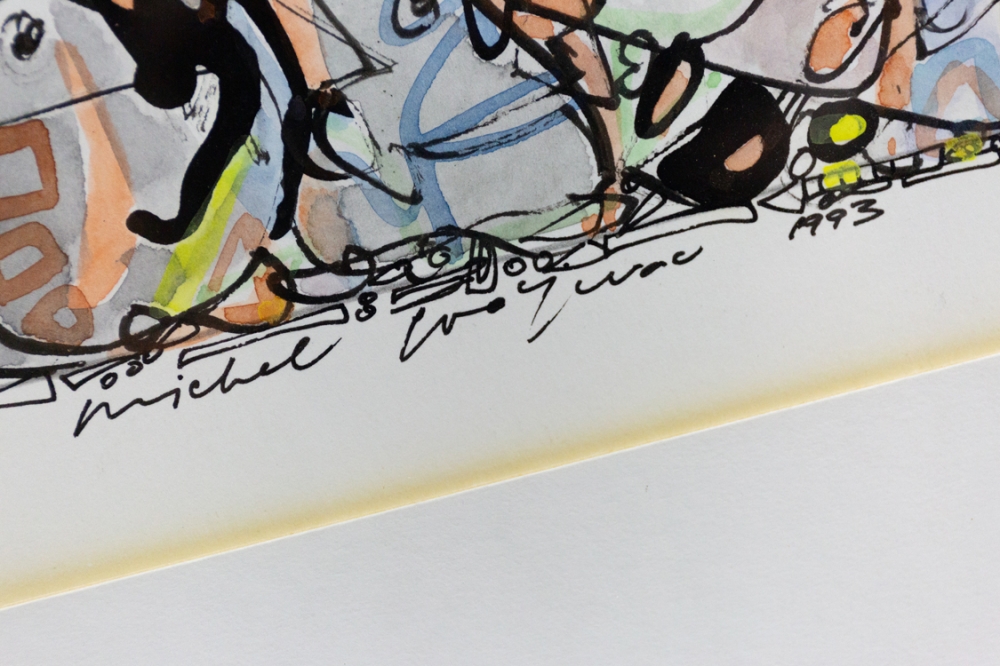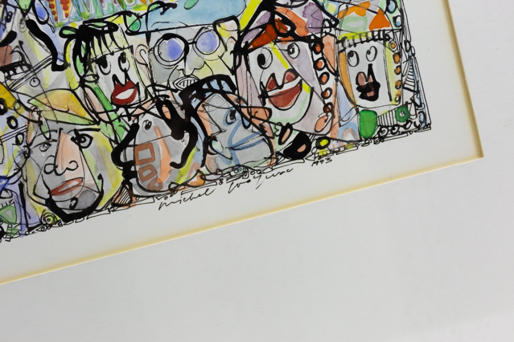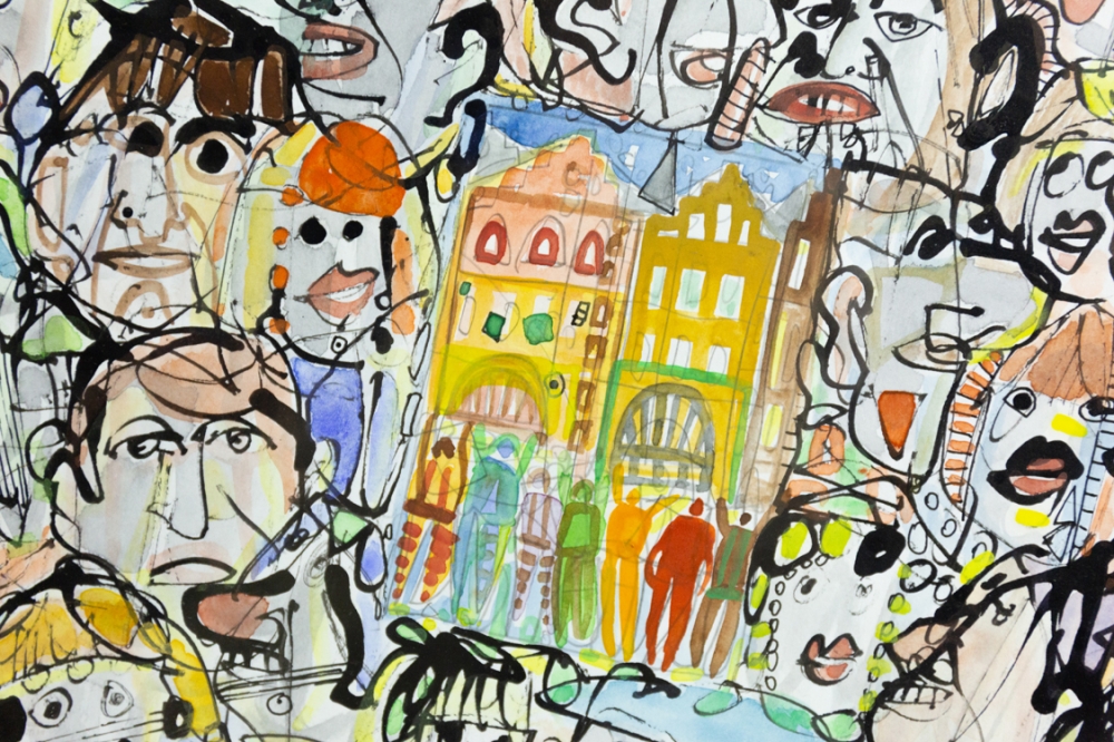 Een schilderij met waterverf en zwarte inkt van Michel Godjevac Van de gentse binnenstad.