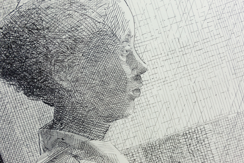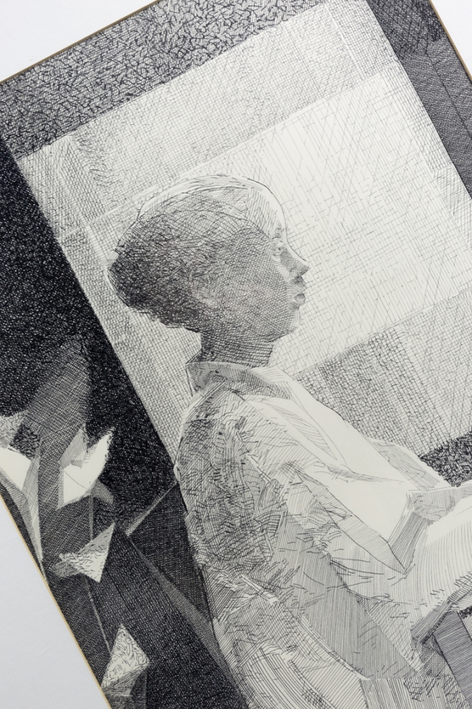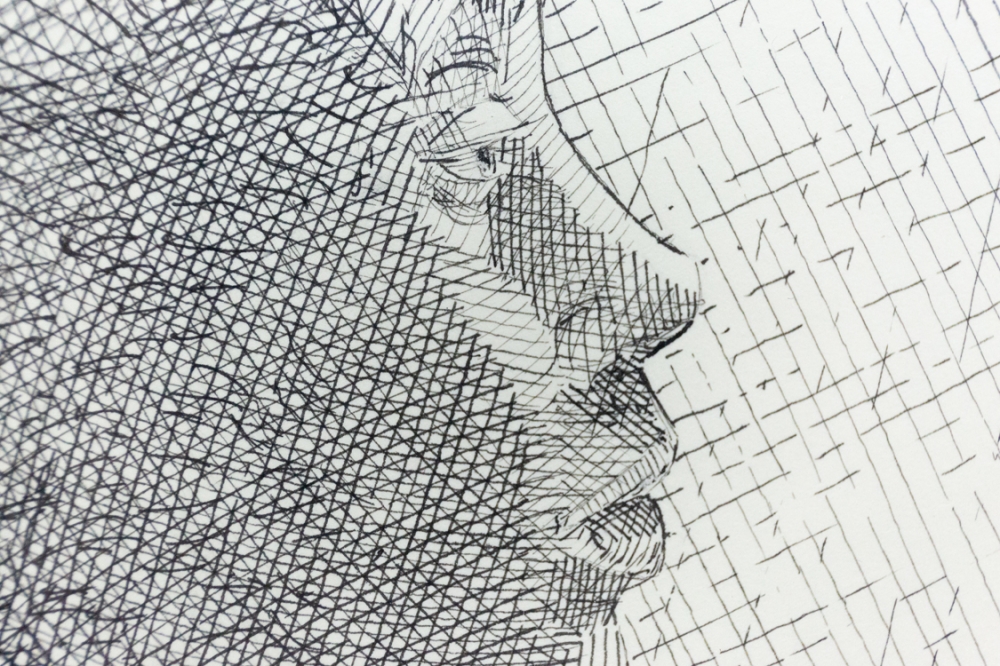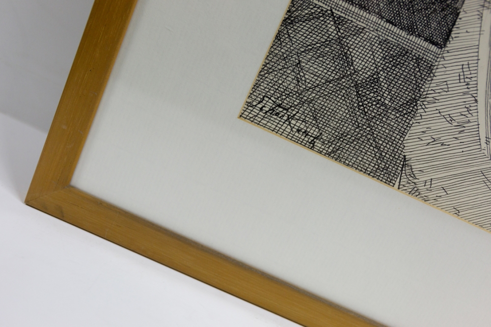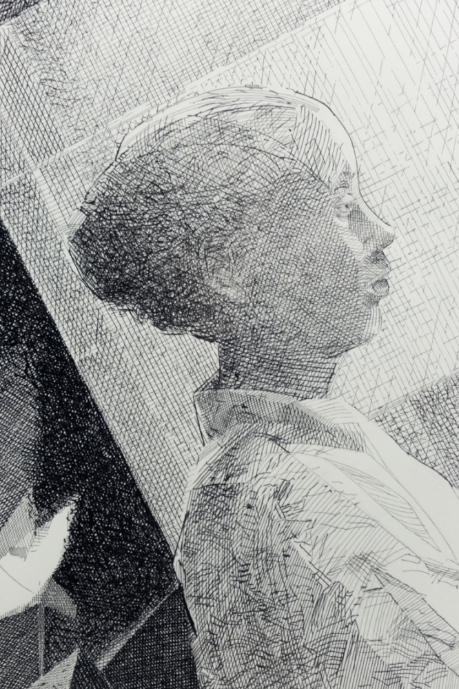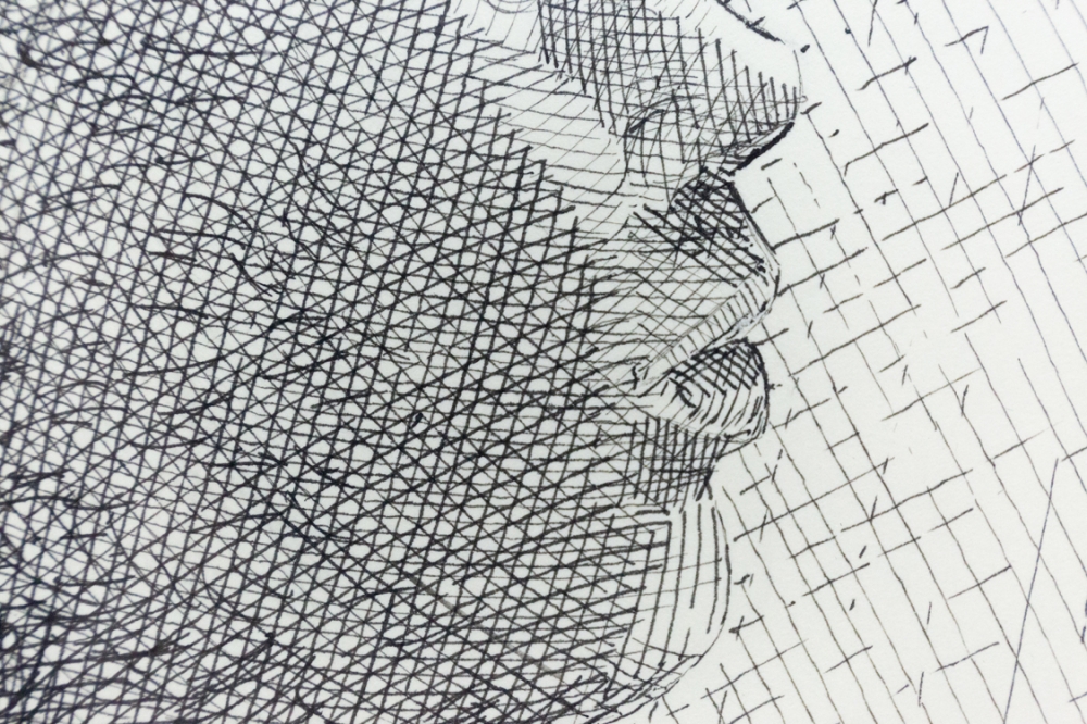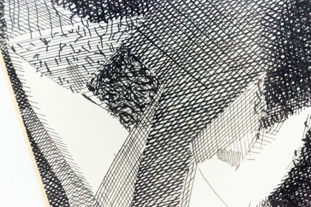 Een tekening op papier van Bernadette Schockaert, waar enkel met lijnen contrast en een beeld wordt gevormd.