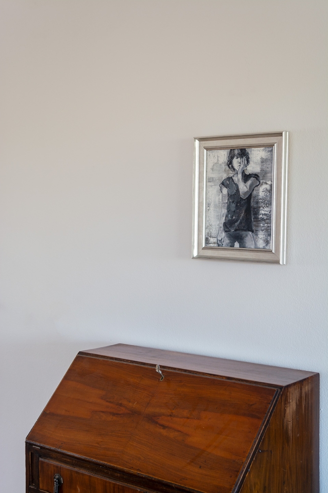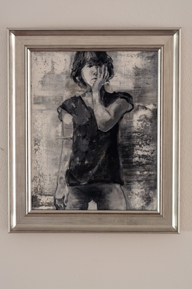 Dit schilderijtje is ontstaand naar een beeld van een gedeeltelijk geklede vrouw. Het schilderijtje is ingelijst in een zilverkleurige lijst . Afmeting inclusief lijst is 38 x 32 cm. Meer werk van Lambert Oostrum is te zien op: www.lambertoostrum.nl.