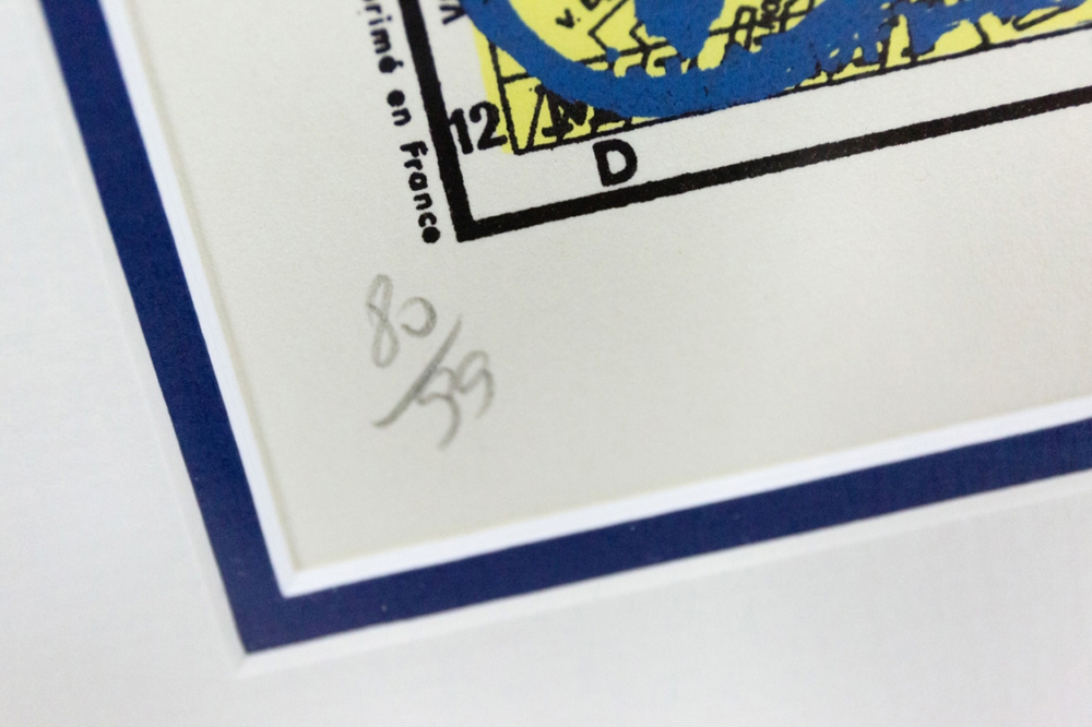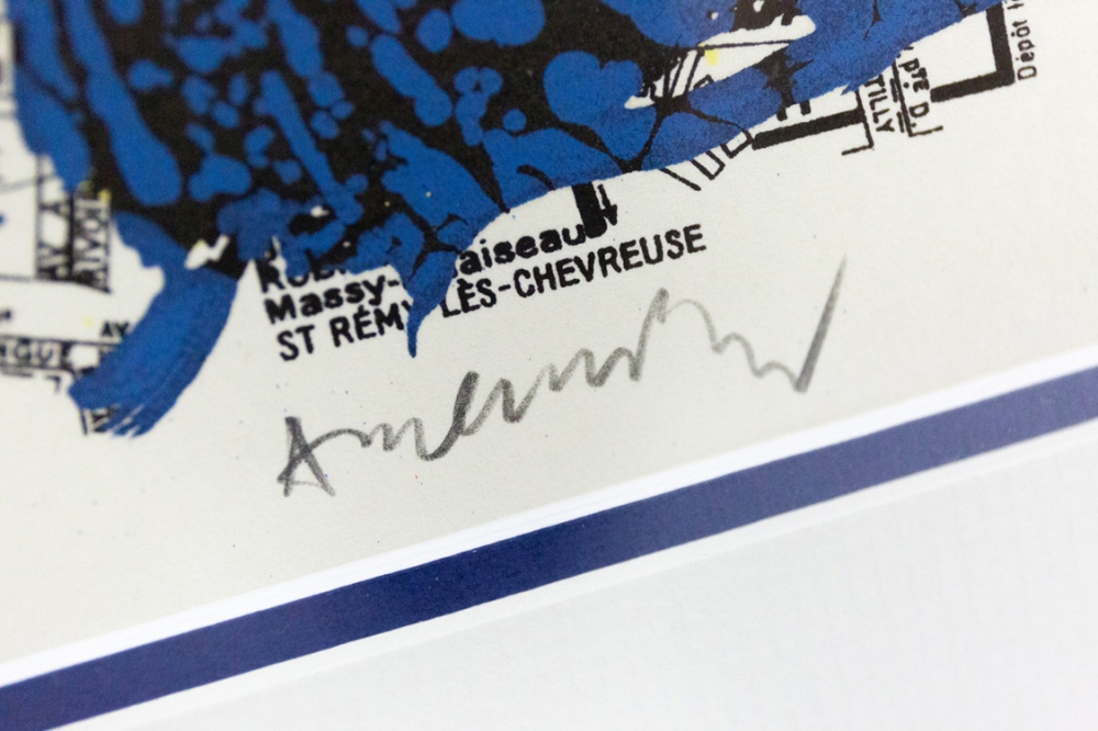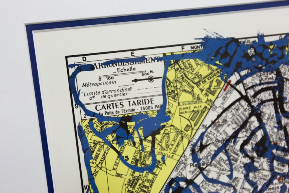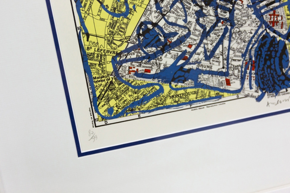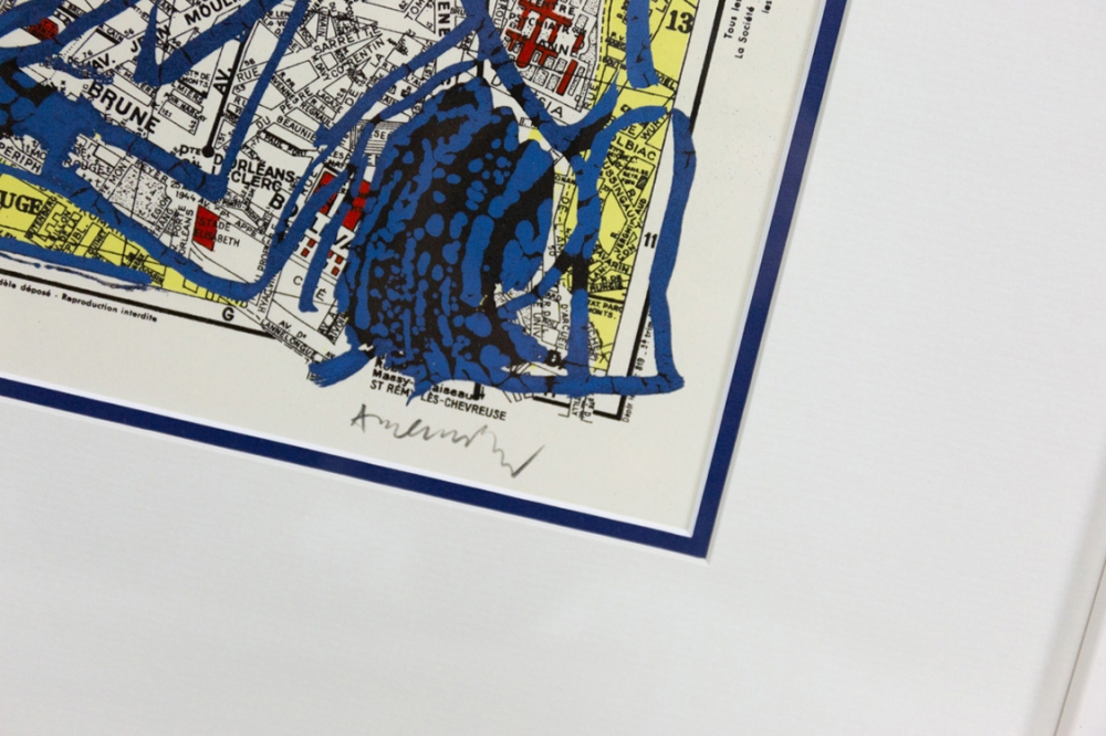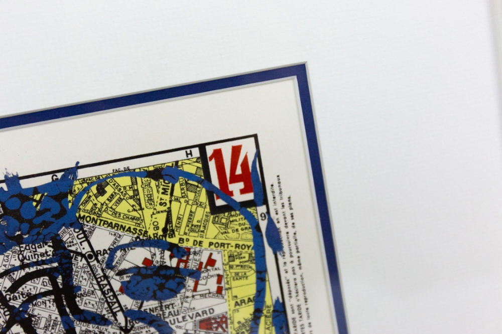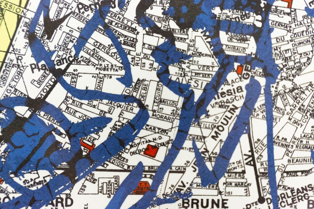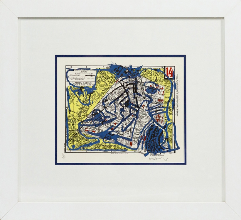 Een lithografie van Pierre Alechinsky op een kaart van het 14e arrondissement van Parijs uit 1980.