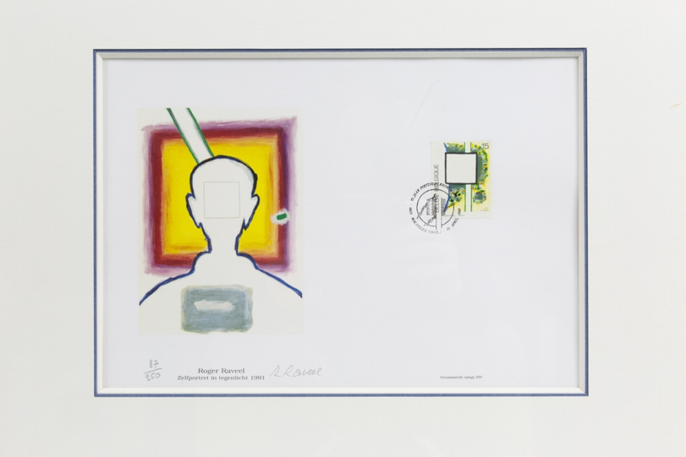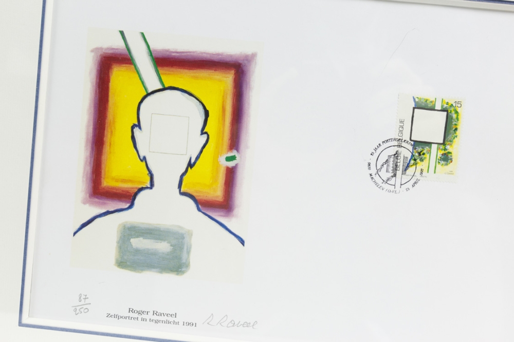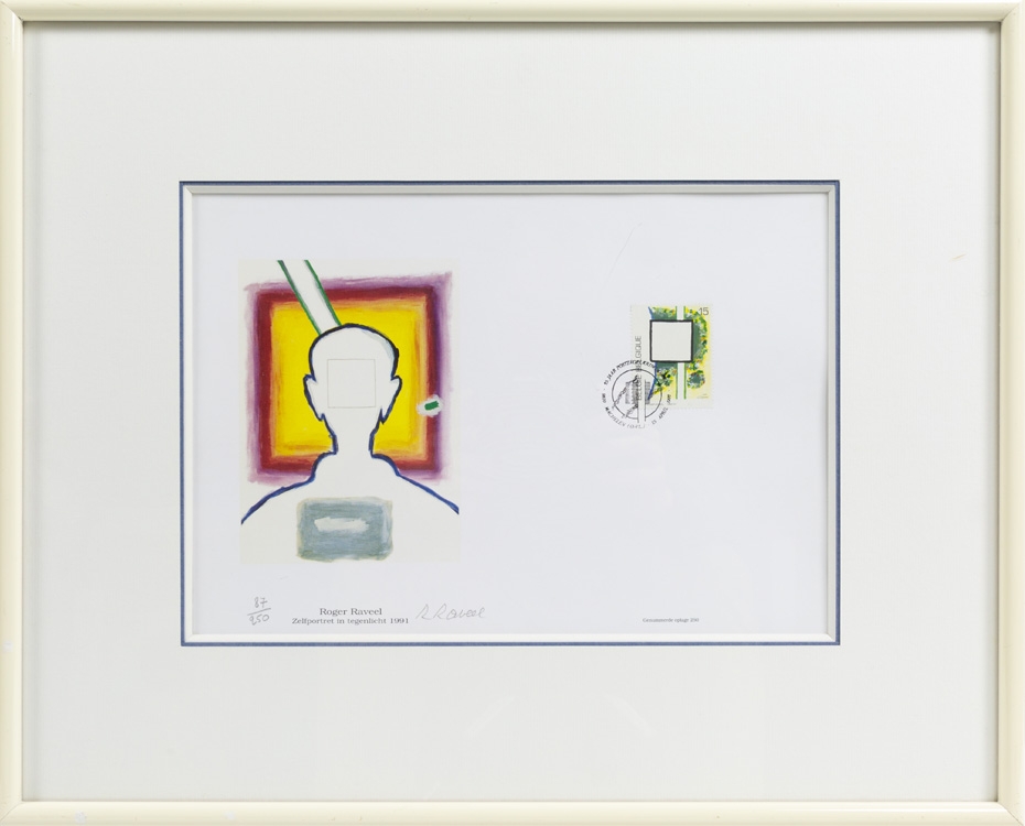 Een postzegel ontworpen door Roger Raveel aangebracht op een offset print van "Portret met tegenlicht".