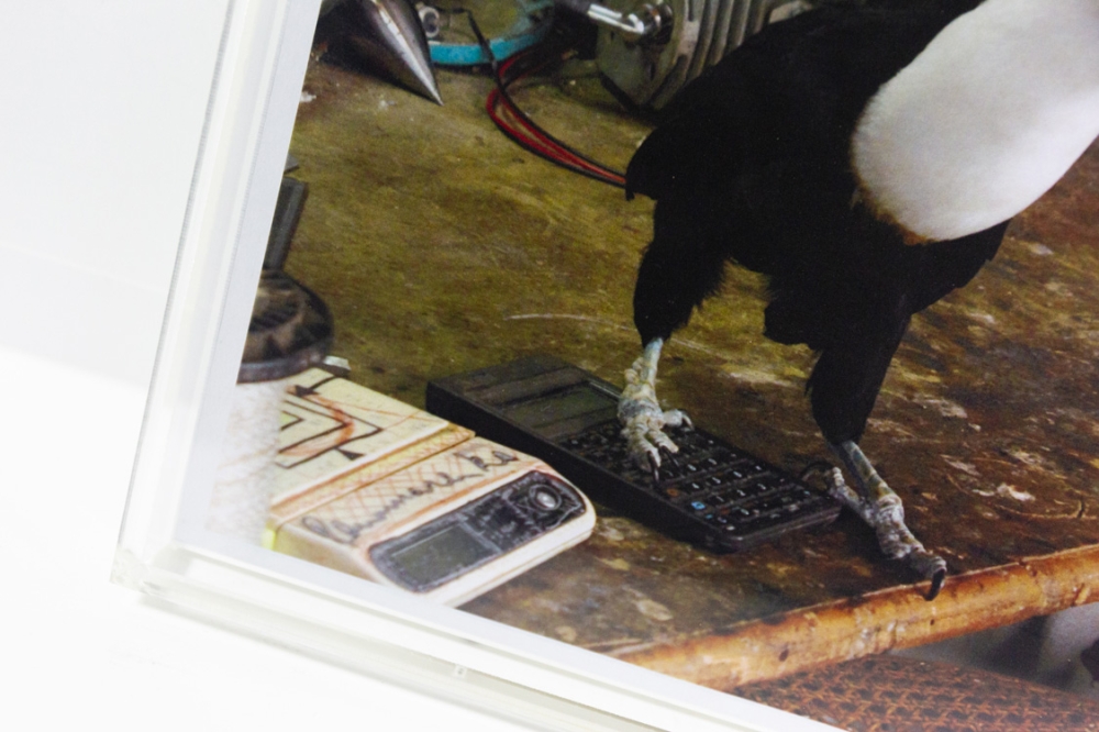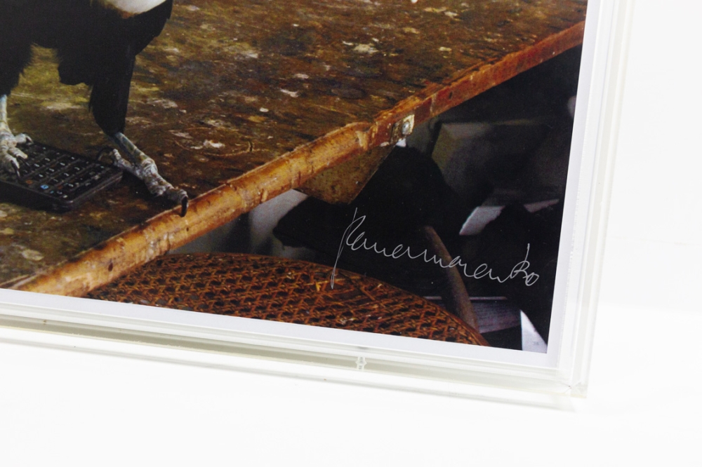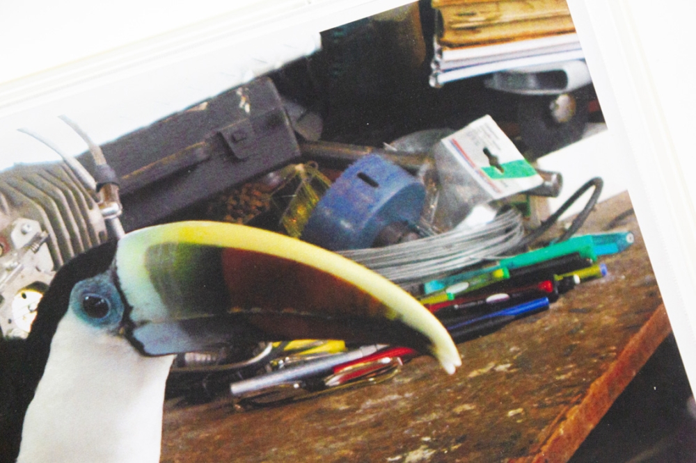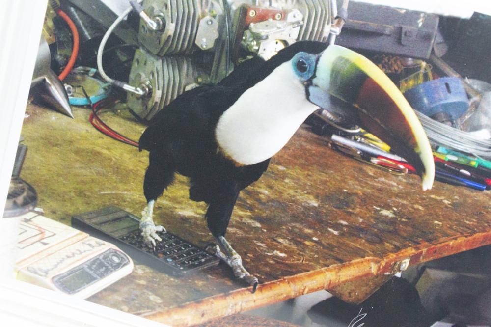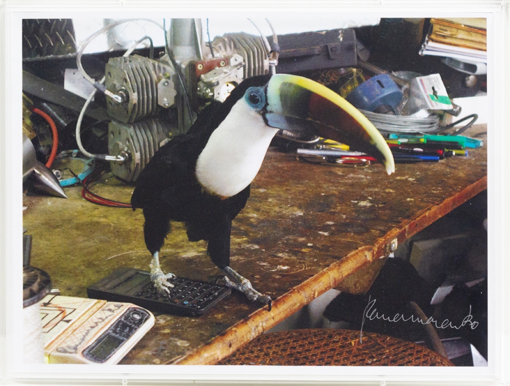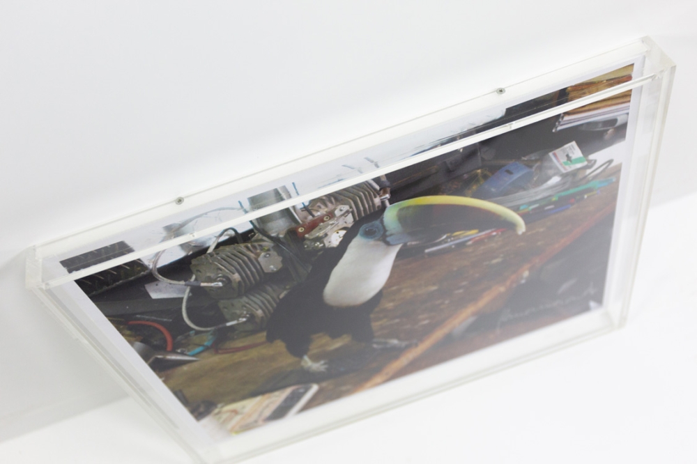 Een met de hand gesigneerde toekan in plexibox van Panamarenko, een offset van een foto uit zijn werkplaats.