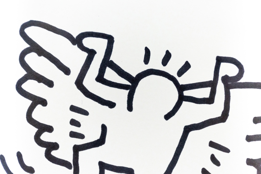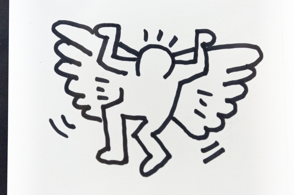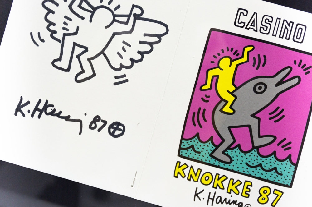 Dit is een uitzonderlijke originele complete uitnodiging voor de opening van de tentoonstelling van Keith Haring in het casino van Knokke in 1987, de meeste uitnodigingen die er nu nog bestaan zijn meestal maar half, want tijdens het bezoek werden de uitnodigingen afgescheurd als inkombewijs. Tijdens het bezoek heeft Keith Haring de Engel getekend en ondertekend voor Mvr. Verleye. Dit werk is mooi ingekaderd in een plexi-staander zodat beide kanten kunnen tentoongesteld worden. Volledige afmeting kader is: (H x B x L) 30cm x 42 cm x 11 cm.